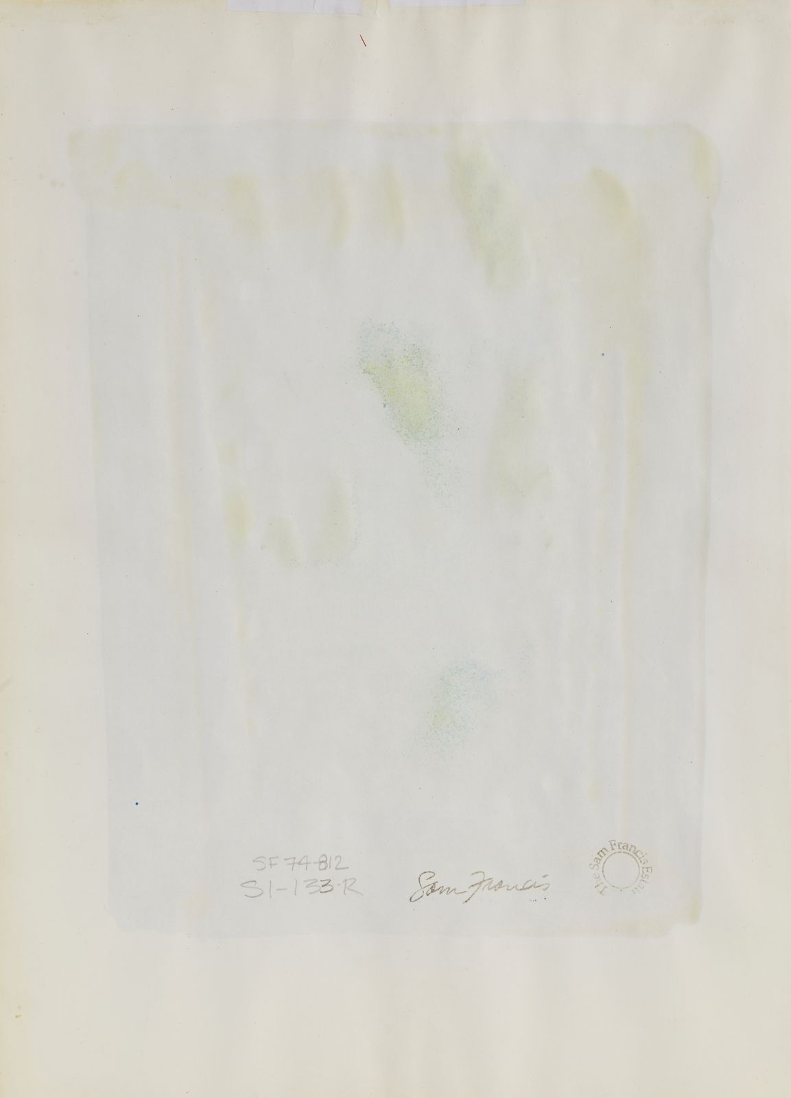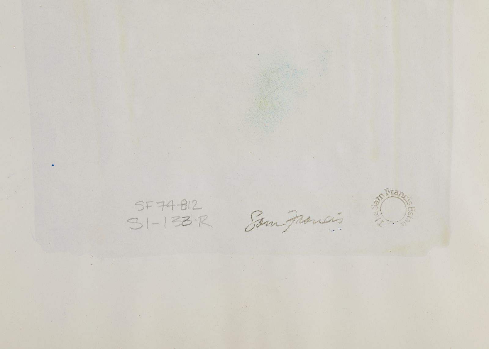 Al retro timbri della firma e The Sam Francis Estate. Opera archiviata presso la Sam Francis Foundation, Glendale, CA, come da documentazione fotografica allegata all'opera riportante il numero d'inventario SF 74-812. Esposizioni: Sam Francis, Galleria d'arte Soave, Alessandria, 20 gennaio-28 febbraio 1998. Pubblicazioni: Sam Francis, Galleria d'arte Soave (catalogo della mostra), a cura di Morelli, 1998, n. 10. Provenienza: Jonathan Novak Contemporary Art, Los Angeles, 1997. Collezione privata. Anni 70'/80'.