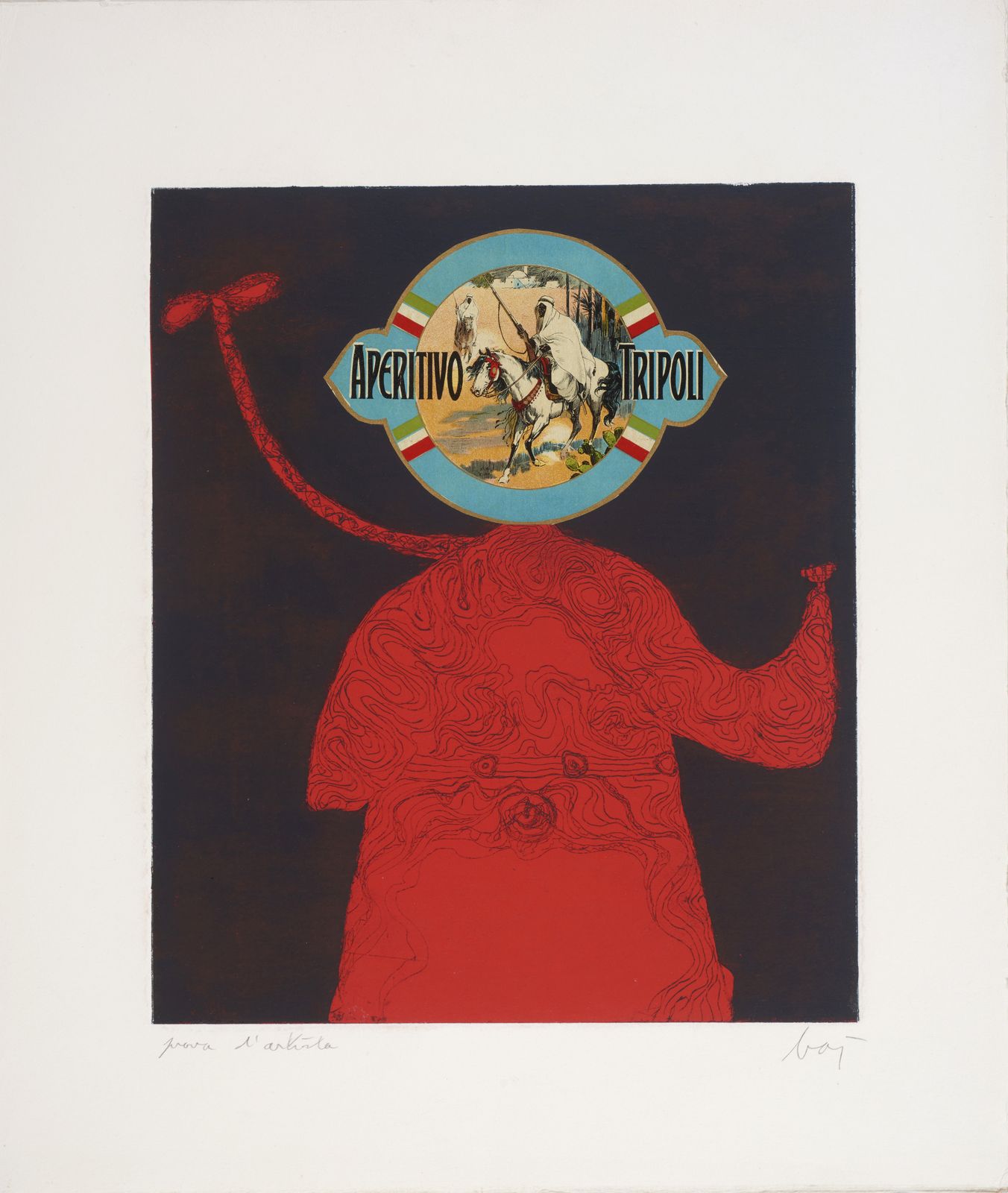 Prova d'artista. Tiratura e firma in basso a matita. Dimensione lastra: 29x24.5 cm. Edizione totale: 60 esemplari numerati da 1 a 60,5 esemplari H.C. numerati da I a V + p.d.a. Pubblicazione: Baj. Catalogo generale delle stampe originali, Electa, Milano, 1986, n. 134 pag. 76. Provenienza: Collezione Lana, Milano. Ringraziamo Roberta Cerini Baj per aver contribuito alla stesura della scheda. Lievi difetti.