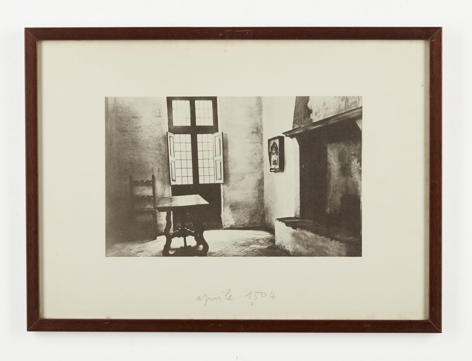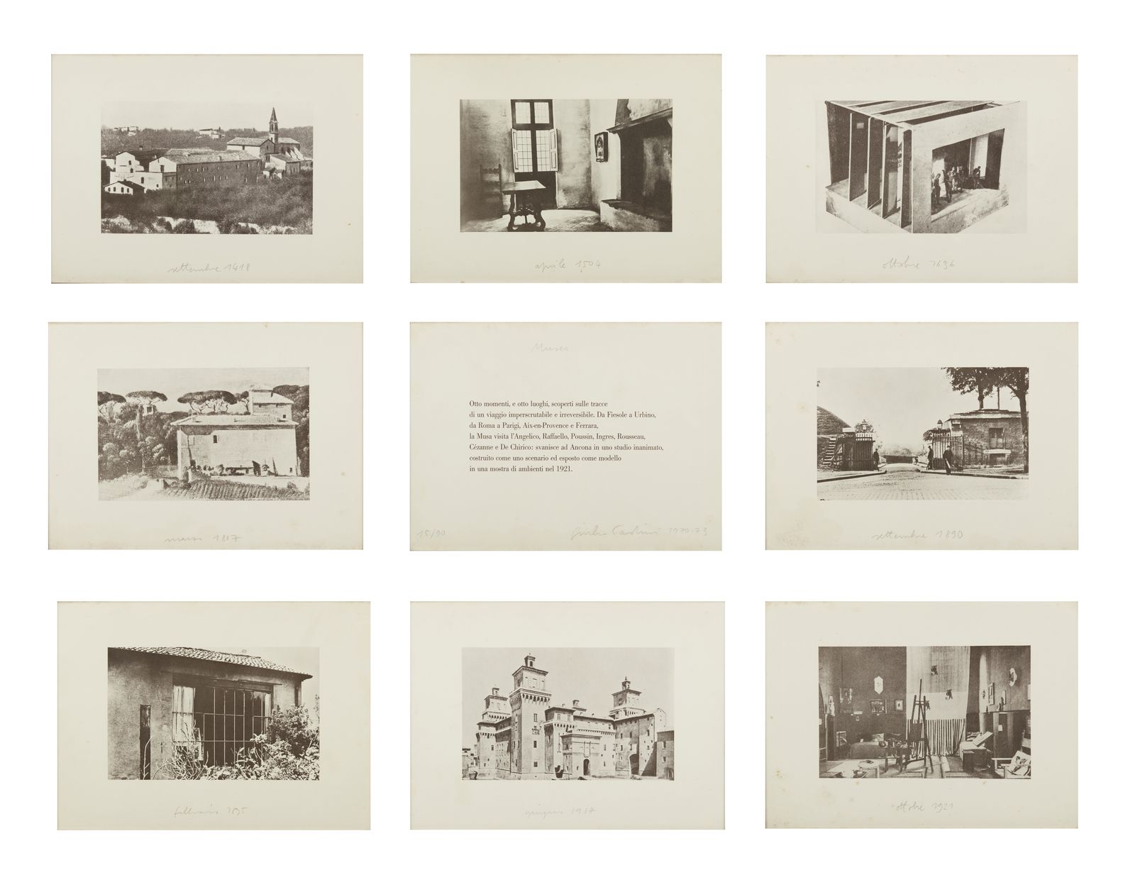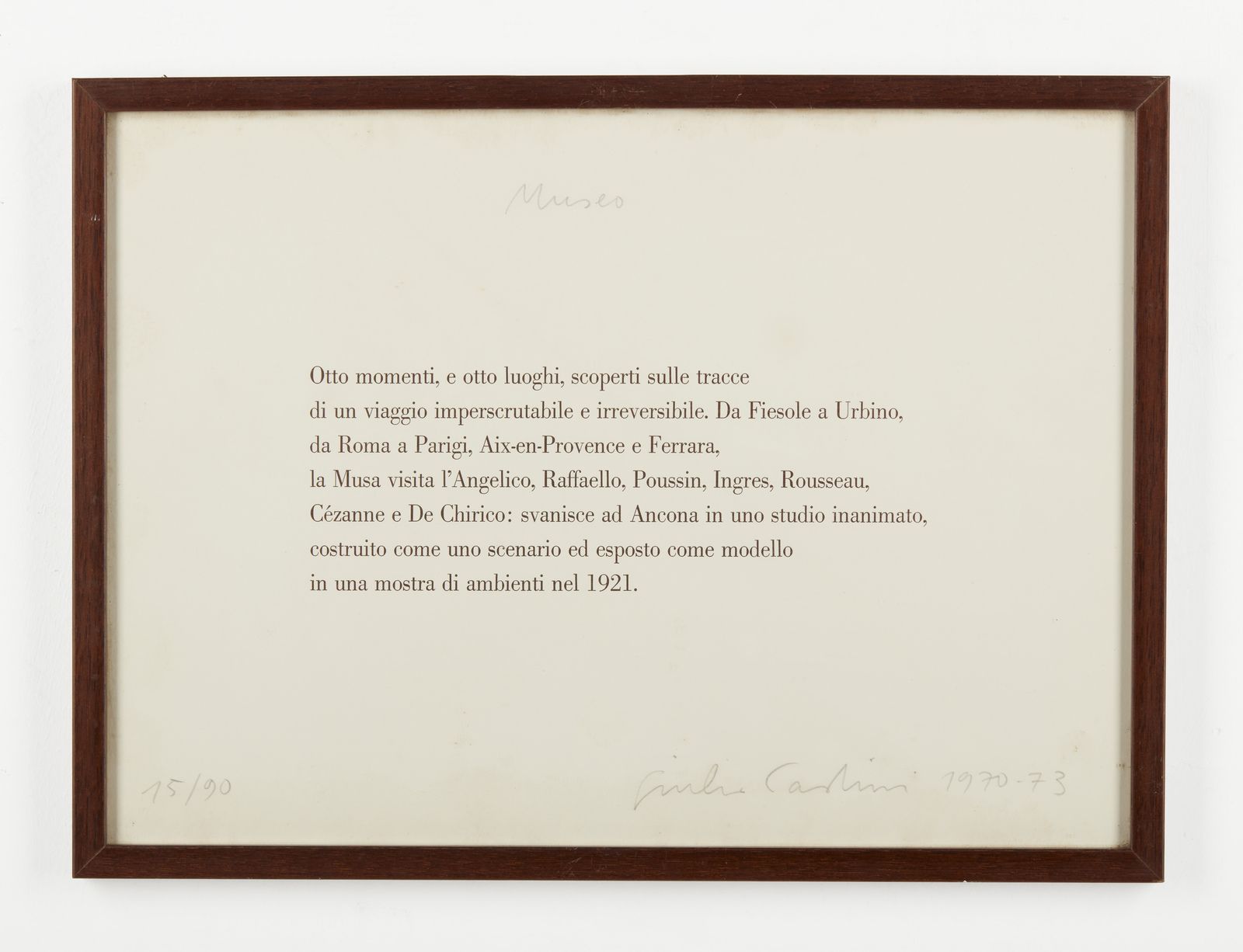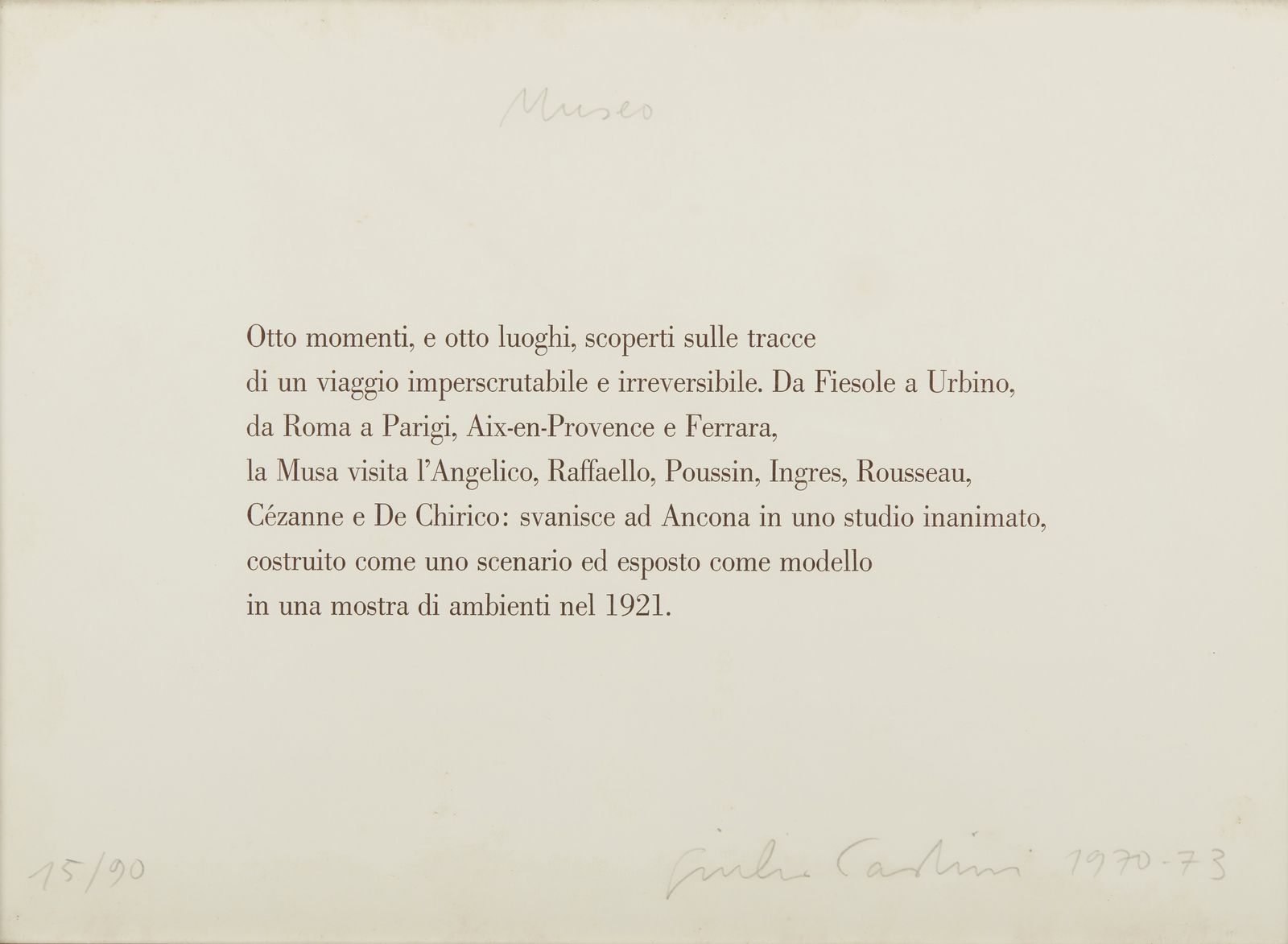 15/90. Tiratura, firma, titolo e anno a matita. Portfolio di 8 litografie, un foglio con testo dell'artista. Otto momenti e otto luoghi, scoperti sulle tracce di un viaggio imperscrutabile e irreversibile. Da Fiesole a Urbino, da Roma a Parigi, Aix en Provance e Ferrara, La Musa visita l'Angelico, Raffaello, Poussin, Ingresc, Rousseau, Cézanne e De Chirico: svanisce ad Ancona in uno studio inanimato, costruito come uno scenario ed esposto come modello in una mostra di ambienti nel 1921. ( Giulio Paolini, Colophone - Museo, 1970-1973).