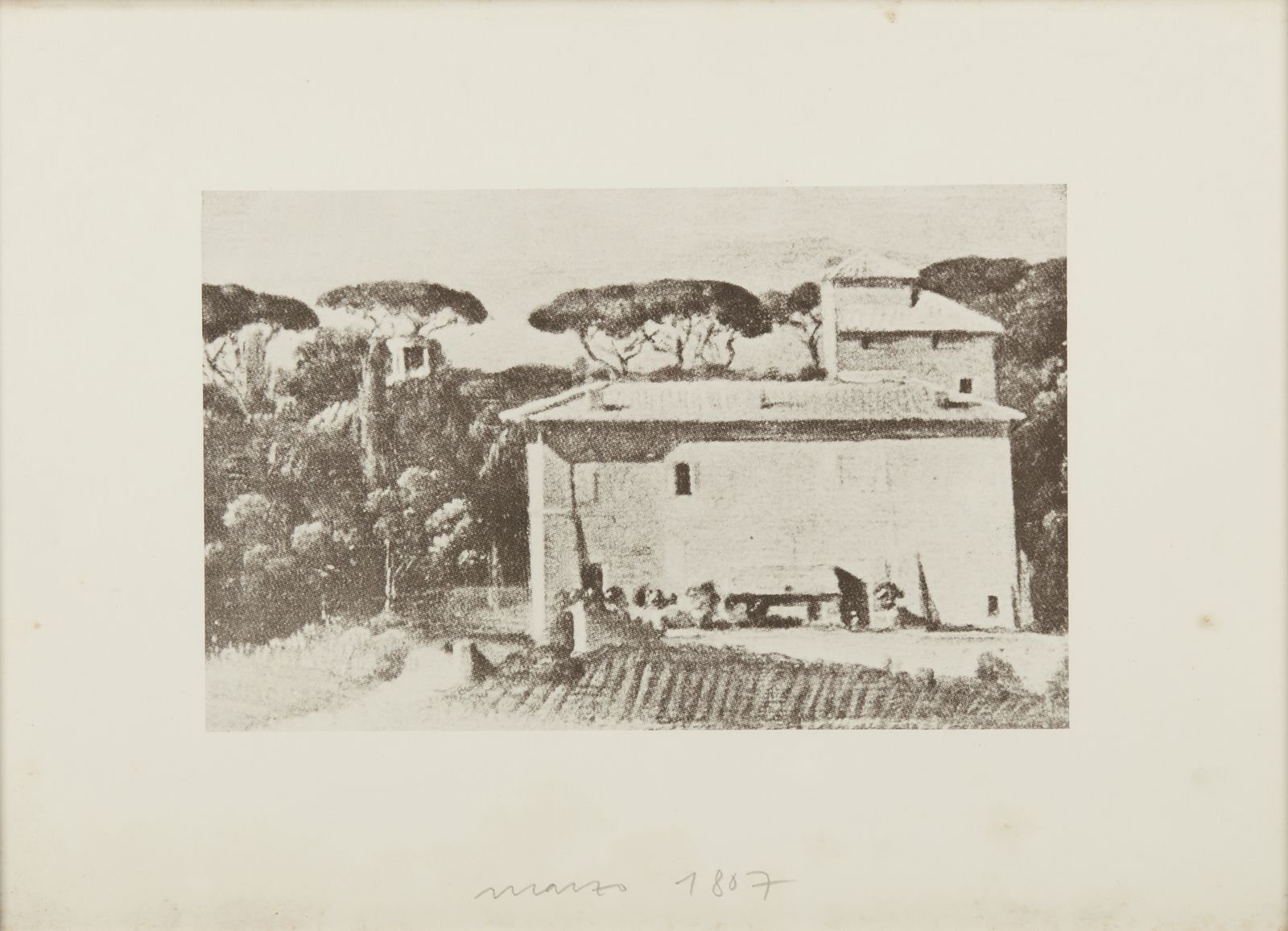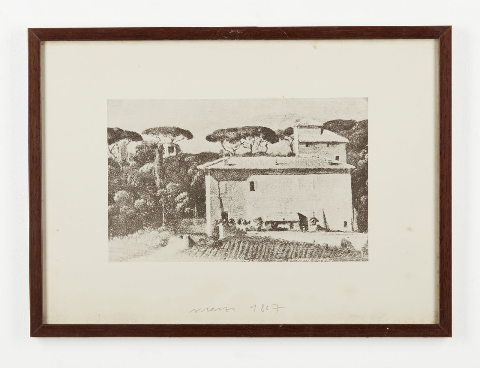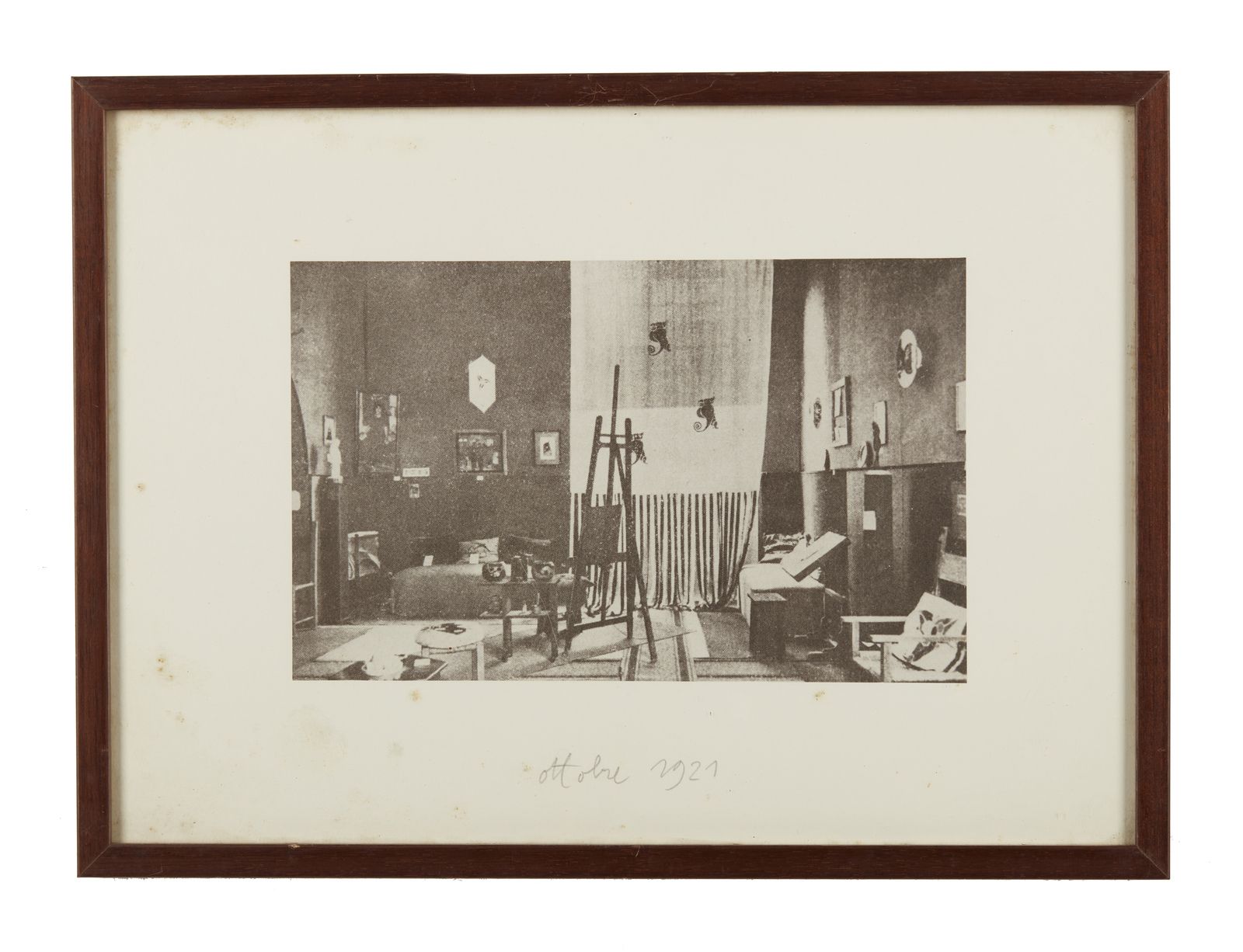 15/90. Tiratura, firma, titolo e anno a matita. Portfolio di 8 litografie, un foglio con testo dell'artista. Otto momenti e otto luoghi, scoperti sulle tracce di un viaggio imperscrutabile e irreversibile. Da Fiesole a Urbino, da Roma a Parigi, Aix en Provance e Ferrara, La Musa visita l'Angelico, Raffaello, Poussin, Ingresc, Rousseau, Cézanne e De Chirico: svanisce ad Ancona in uno studio inanimato, costruito come uno scenario ed esposto come modello in una mostra di ambienti nel 1921. ( Giulio Paolini, Colophone - Museo, 1970-1973).