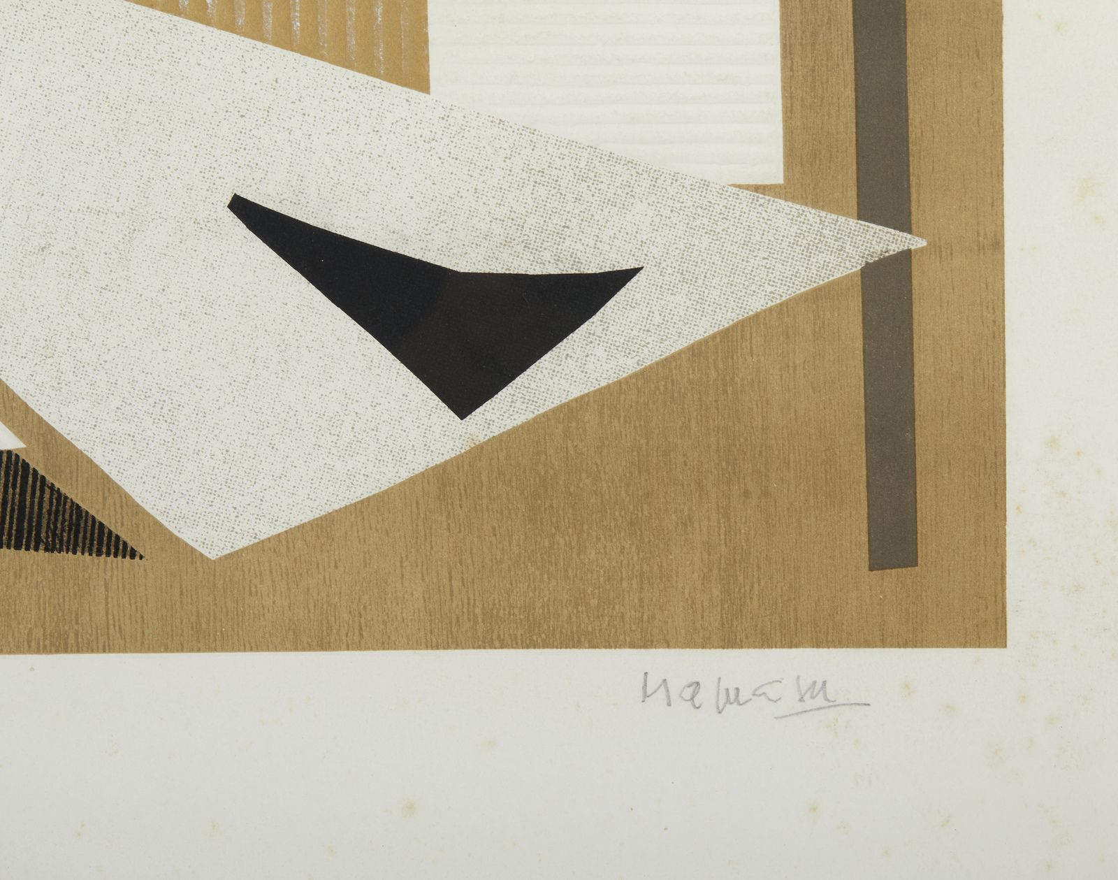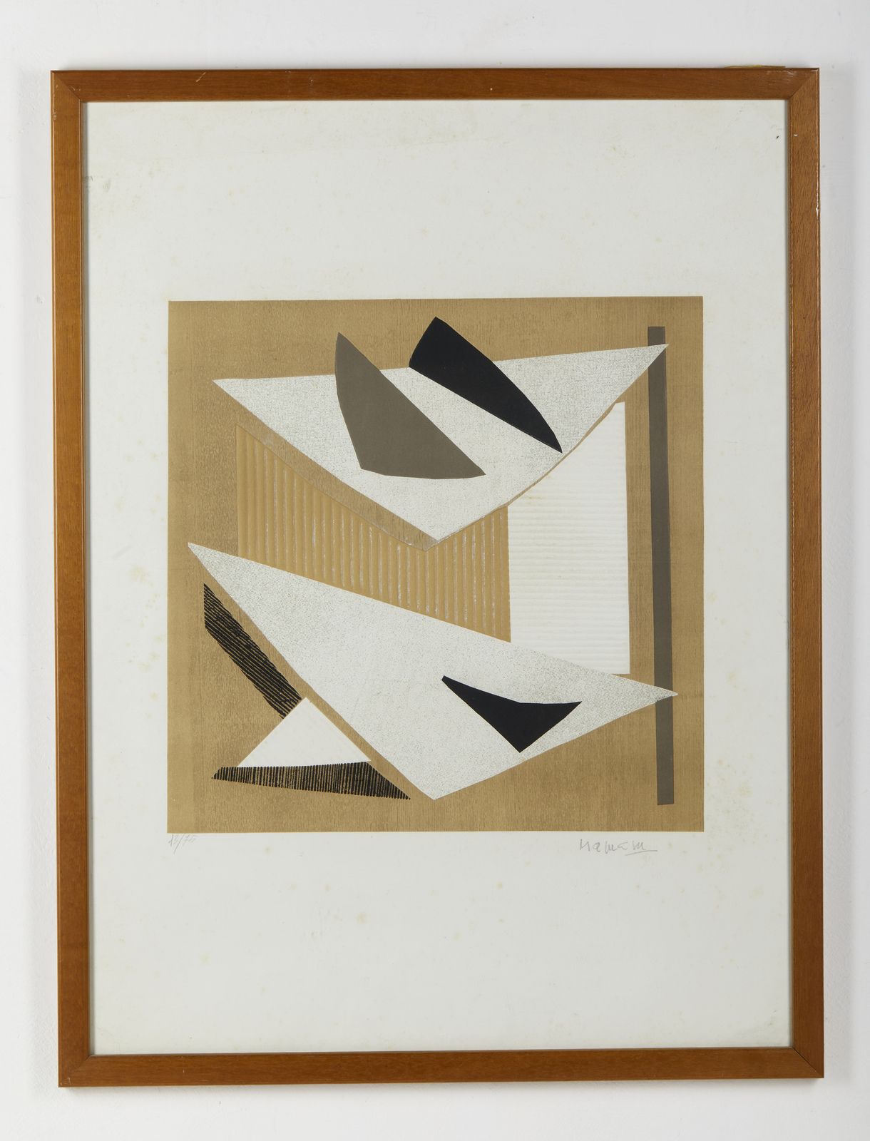 13/75. Tiratura e firma in basso a matita. Dimensione lastra: 44.5x44.5 cm. Il foglio fa parte della cartella I collage di Magnelli che comprende dieci litocalcografie originali a colori presentate con testi di Murilo Mendes e Nello Ponente. Editore: Il Collezionista d'Arte Contemporanea. Pubblicazione: Magnelli L'Oeuvre Gravè, Bibliothèque Nationale, Parigi 1980. Difetti.