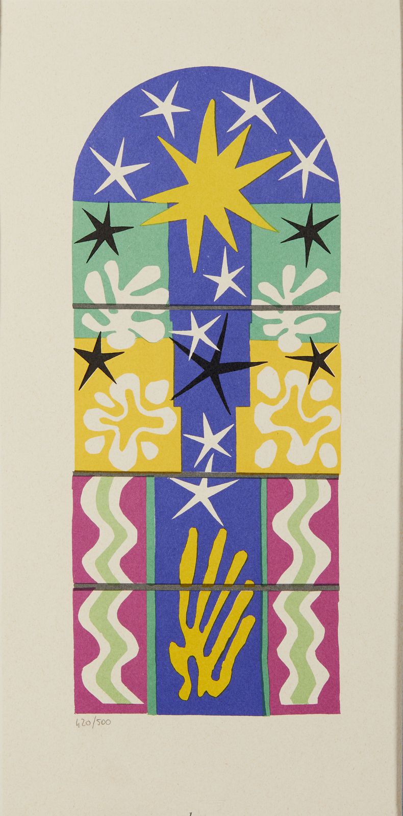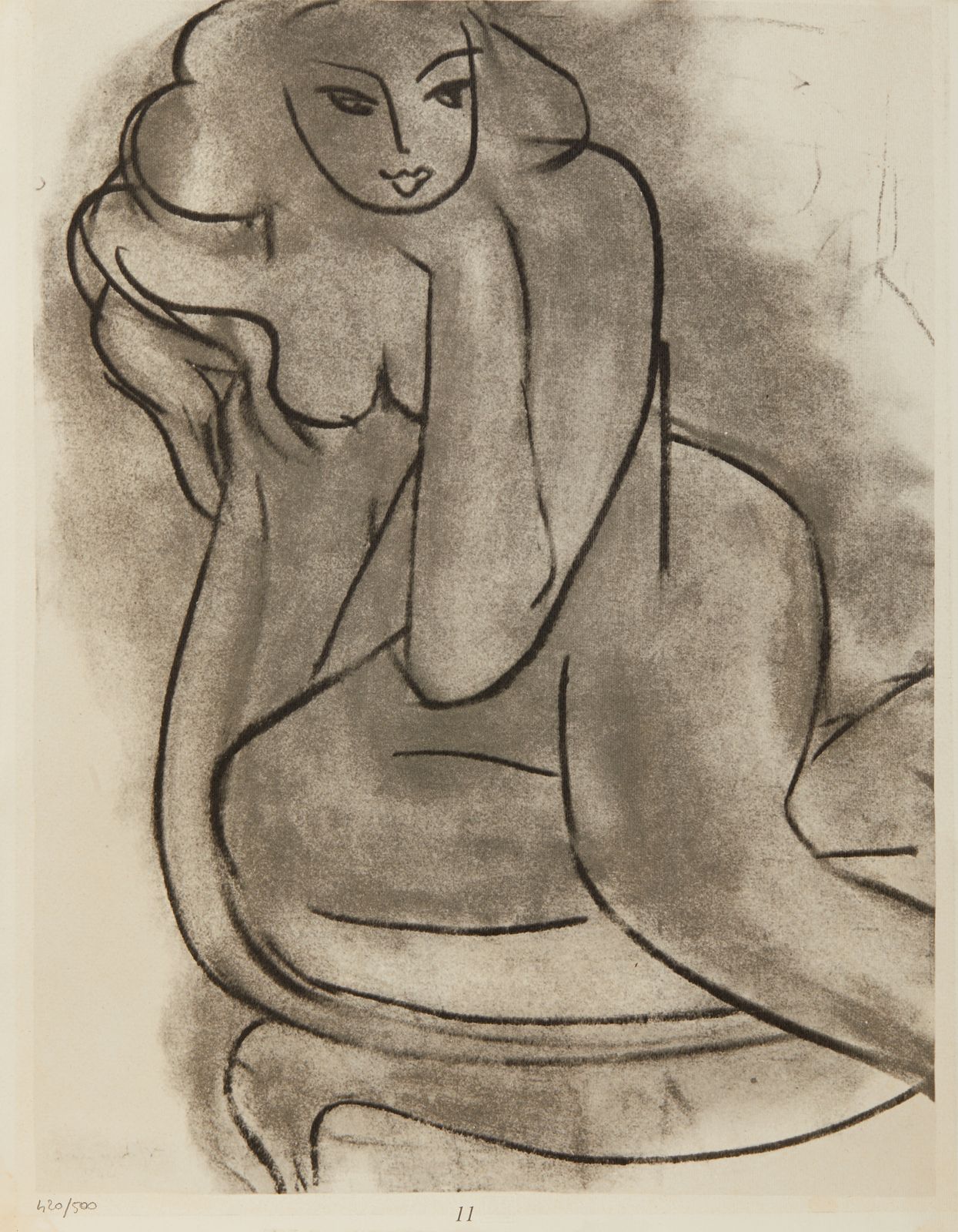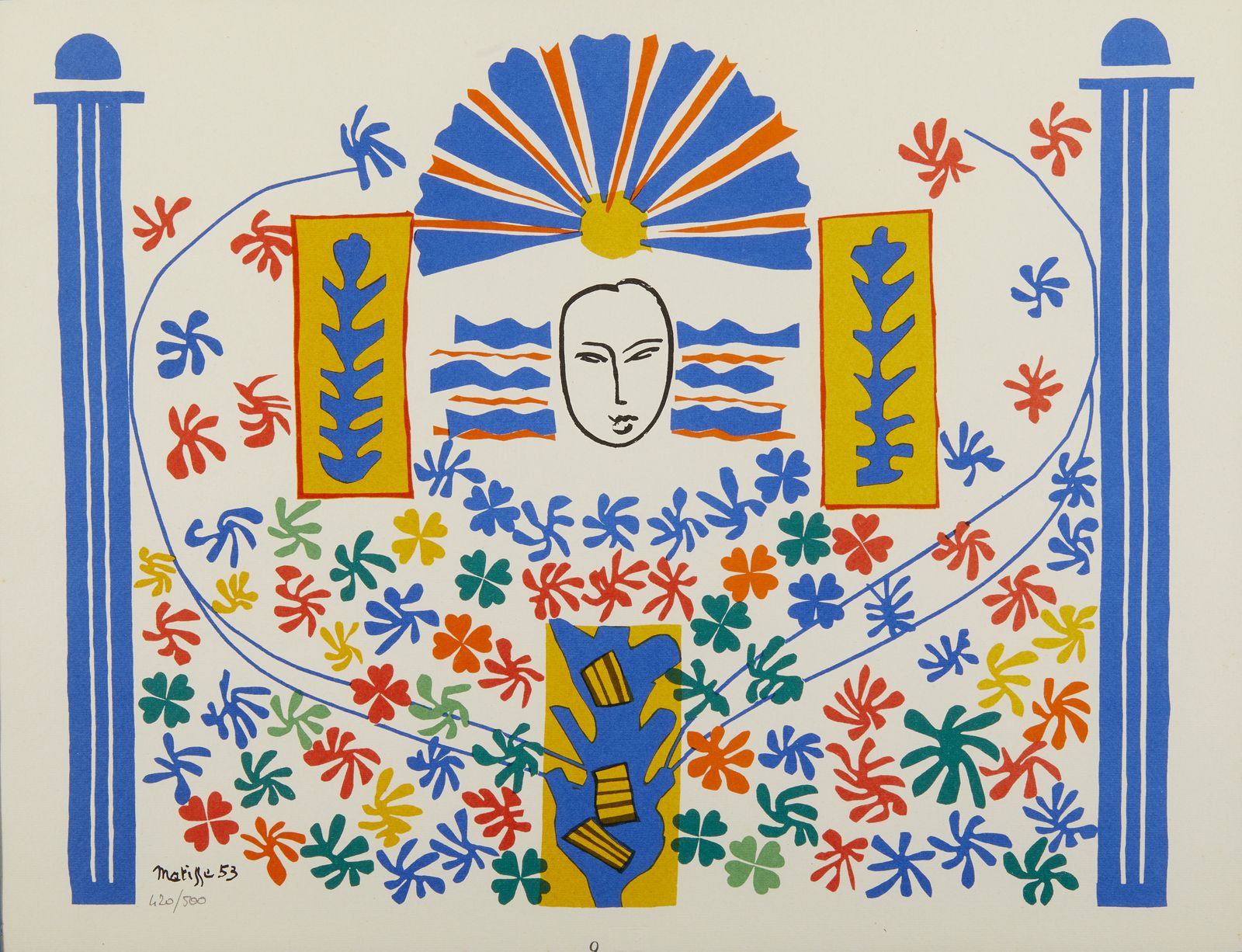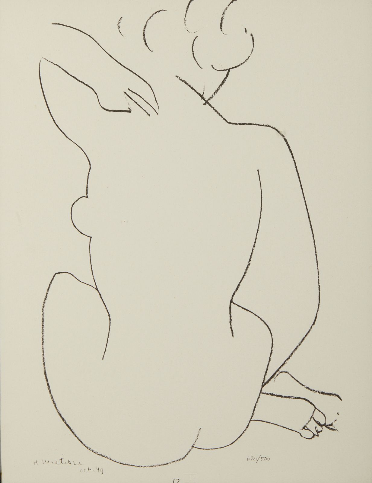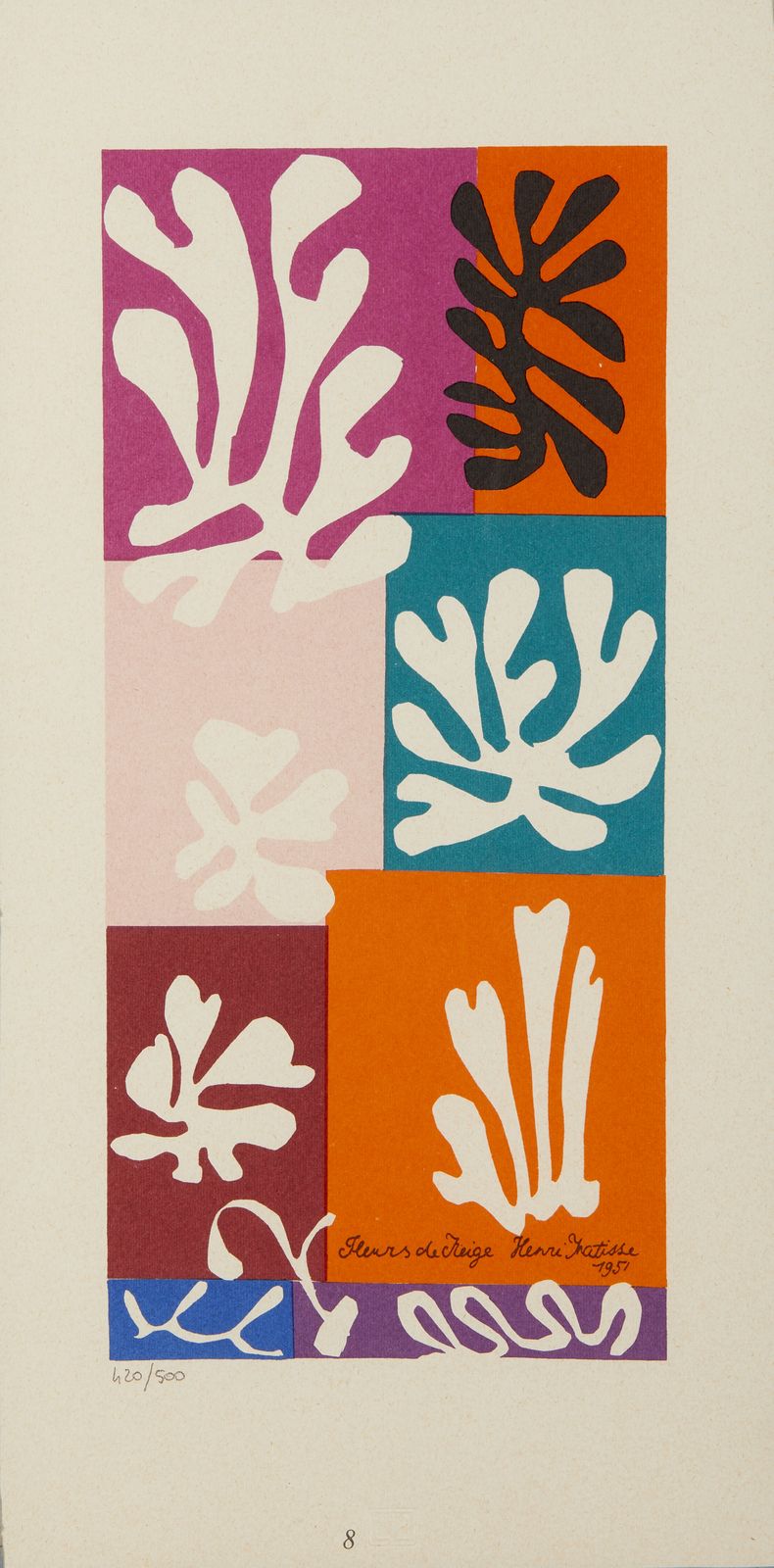 Ogni foglio presenta la firma e l'anno in lastra, Fogli dai volumi Matisse -- Dernières Oeuvres de Matisse 1950-1954 (Verve vol. IX, nos. 35 et 36): Paris: Editions de la Revue Verve, 1958.1. Nuit de Noel. 42x21 cm. n°1.2. Poissons chinois. Firma e anno in basso a destra a lastra. 42x21 cm.1951. n°2. 3. Fleurs de Neige. Titolo, firma e anno in basso a destra a lastra. 42x21 cm. 1951. n°8.4. Senza titolo. 43x33 cm. n°11.5. Nudo blu. Firma e anno in basso a destra a lastra. 43x33 cm. 1952. n°5.6. Nudo blu II. Firma e anno in basso a sinistra a lastra. 43x33 cm. 1952. n°6.7. Memoria di Oceania. Firma e anno in basso a sinistra a lastra. 43x33 cm. 1953. n°10.8. Apollo. Firma e anno in basso a sinistra a lastra. 33x43 cm. 1953. n°9.9. Tristezza. Firma e anno in basso a destra a lastra. 33x43 cm. 1952. n°4.10. La Négresse. 33x43 cm. n°7.11. Nudo di schiena. Firma e anno in basso a sinistra a lastra. 43x33 cm. 1949. n°12.
