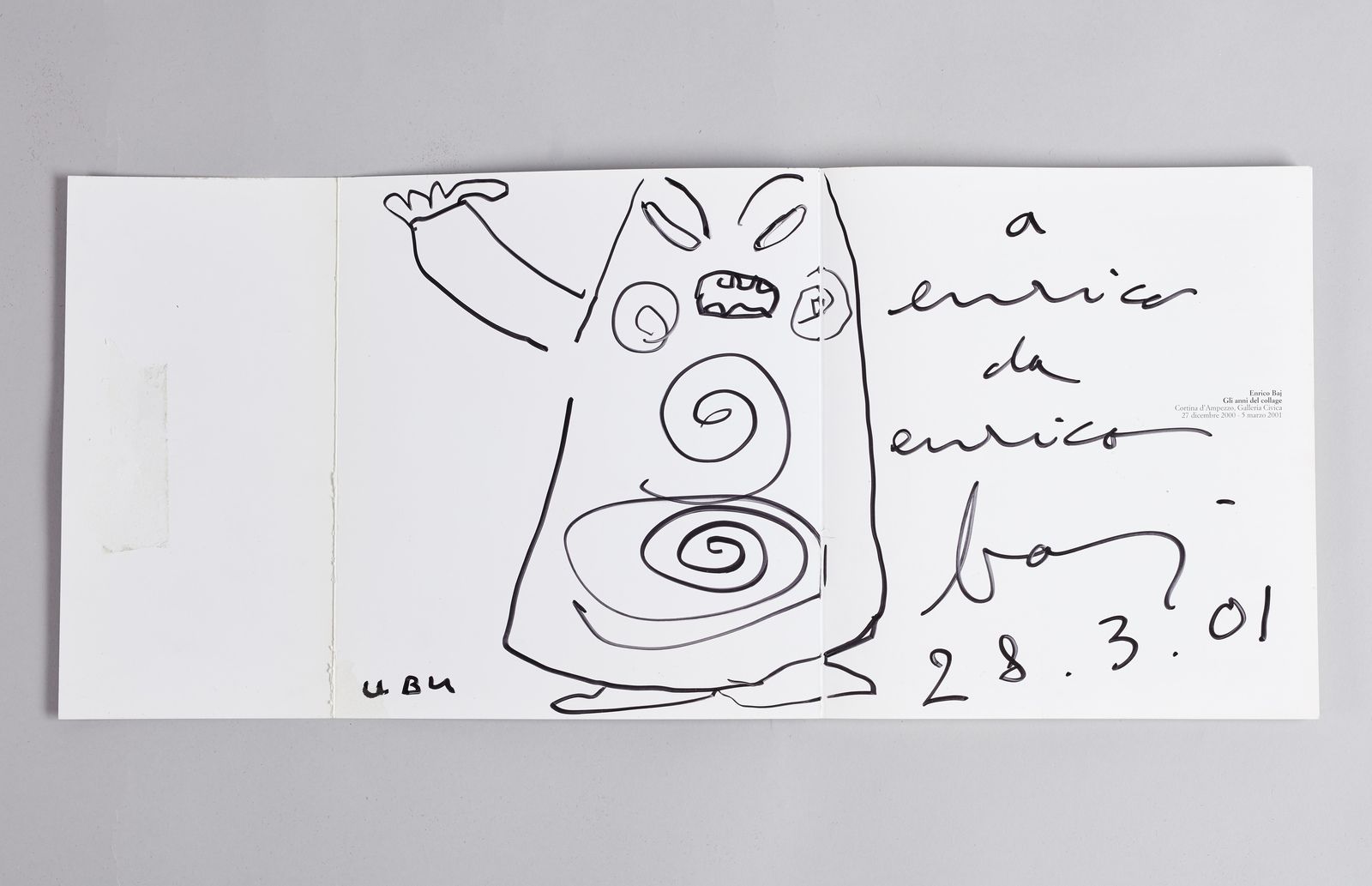 Firma, anno, dedica e disegno a pennarello all'interno del catalogo della mostra 'Enrico Baj: gli anni del collage', Cortina d'Ampezzo, Galleria Civica 27 Dicembre 2000 - 05 Marzo 2001. Edizioni Gabriele Mazzotta, Milano. Lievi difetti.