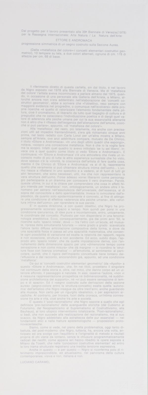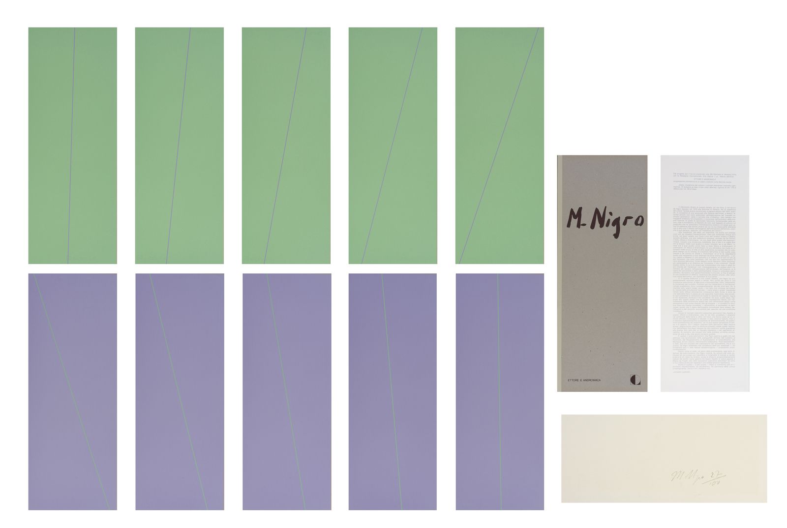 27/100. Cartella composta da n.10 fogli firmati e numerati al retro a matita. Entro custodia originale. Editore Studio d’Arte Contemporanea Dabbeni. Le dimensioni segnalate in catalogo sono di ciascun foglio. L’opera è stata realizzata dal progetto per il lavoro presentato alla 39° Biennale di Venezia (1978) per la Rassegna Internazionale: Arte Natura/ La Natura dell’Arte: “ETTORE e ANDROMACA”. Prefazione contenuta nella cartella a cura del prof. Luciano Caramel.