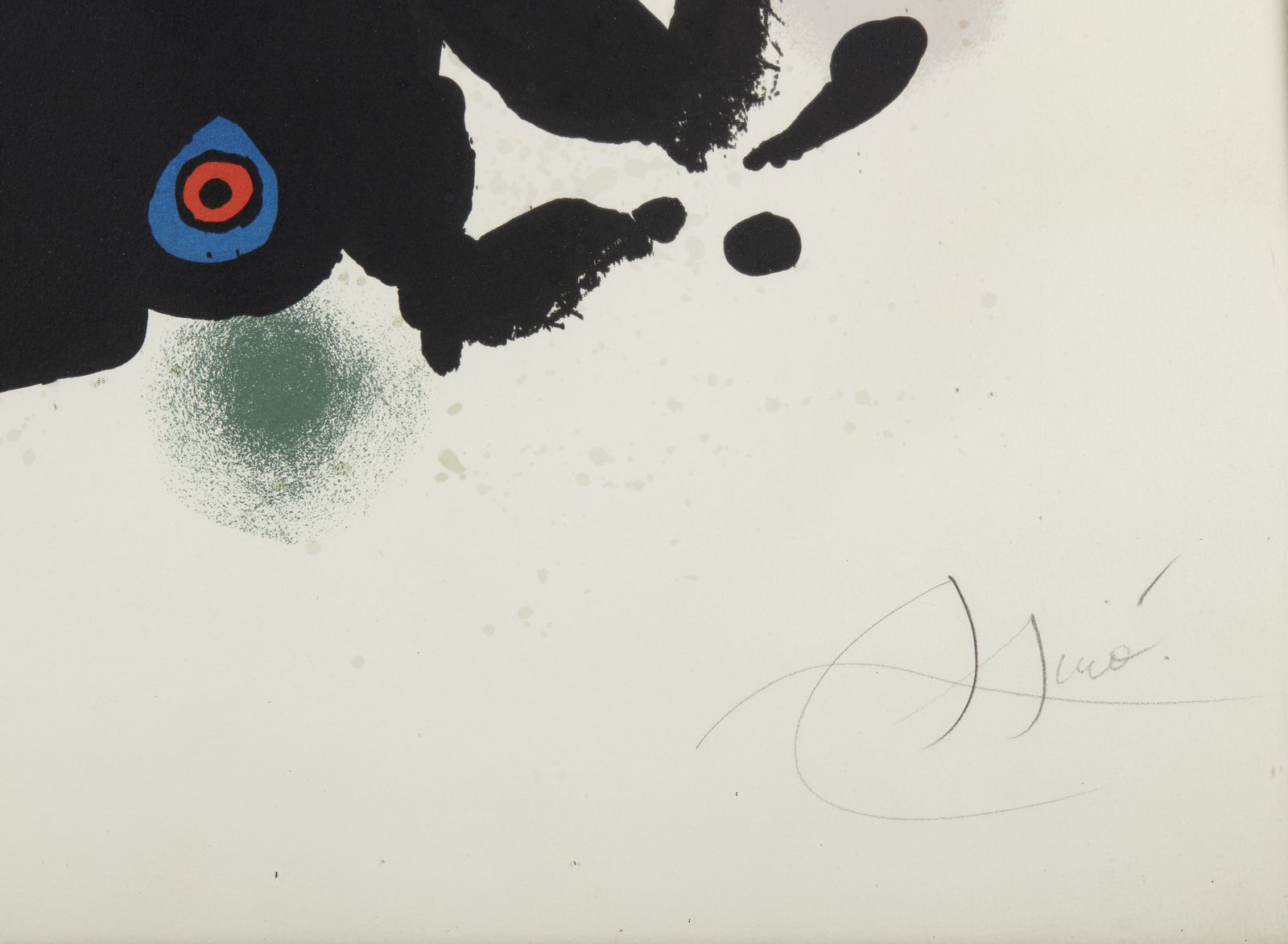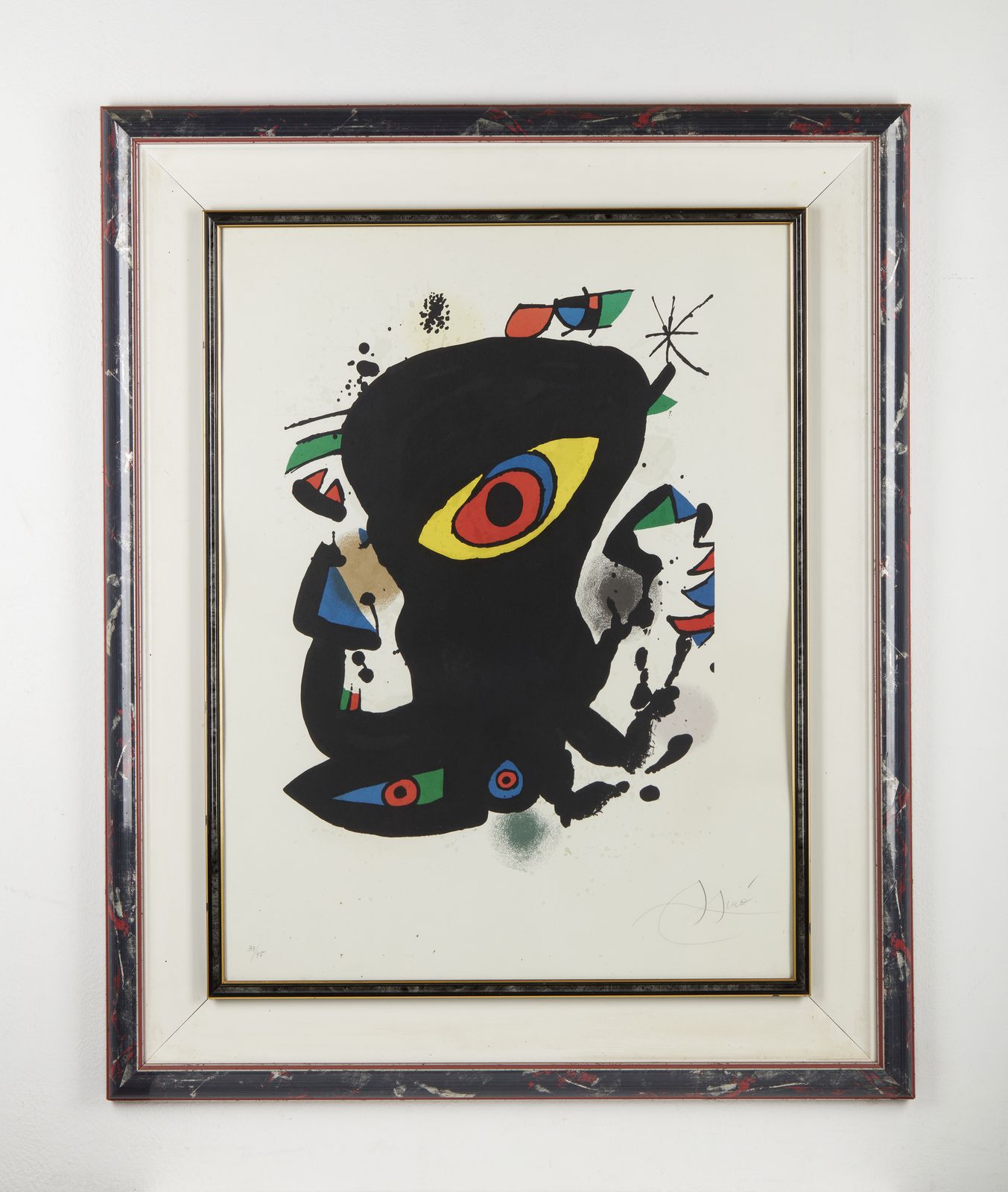 37/75. Tiratura e firma in basso a matita. Serigrafia realizzata per l'esposizione colletiva inaugurale della Galleria Maeght di Barcellona (Novembre-dicembre 1974). Edizione totale: 75 esemplari su carta Guarro, numerati e firmati di formato: 69x52,5 cm+1300 esemplari di formato 65,5x40 cm. Editore: Galeria Maeght, Barcellona. Stampatore: Litografias Artisticas Damià Xaus, Barcellona. Bibliografia: J.C. Clemente, Mirò invade las calles de Barcelona. 'Gazeta del Arte', Madrid, Anno III, n. 35, 15 gennaio 1975, pag. 4.