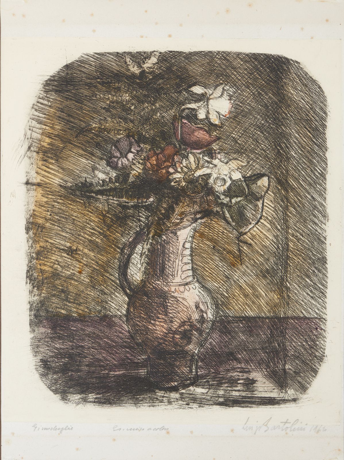 Titolo, firma e anno in basso a matita. Firma e anno in basso a sinistra a lastra. Esemplare unico a colori. Dimensione lastra: 33.5x29.5 cm. Opera pubblicata nell'Archivio online delle acqueforti di Luigi Bartolini a cura di Dario Palma con la collaborazione di Luciana Bartolini ( https://www.luigibartolini.com/anemoni-e-giunchiglie.html ). Pubblicazioni: Le incisioni di Luigi Bartolini, C.A. Petrucci, Calcografia Nazionale Roma, 1951, n. 855 (es. 3). n. 870 (e.u.). n. 877 (e.u.). Le incisioni di Luigi Bartolini, G. Ronci, Calcografia Nazionale Roma, 1962, n. 855 (es. 3). n. 870 (e.u.). n. 877 (e.u.). Catalogo aggiornato dell’Opera Grafica di Luigi Bartolini, C. Barsanti, Galleria Marino Roma, 1972, n. 983 (e.u.). n. 998 (es. 50). Esposizioni: Galleria Circolo di Cultura, Bologna, 1954. Galleria Gianni Gabba, Parma, 1954. Lievi difetti.