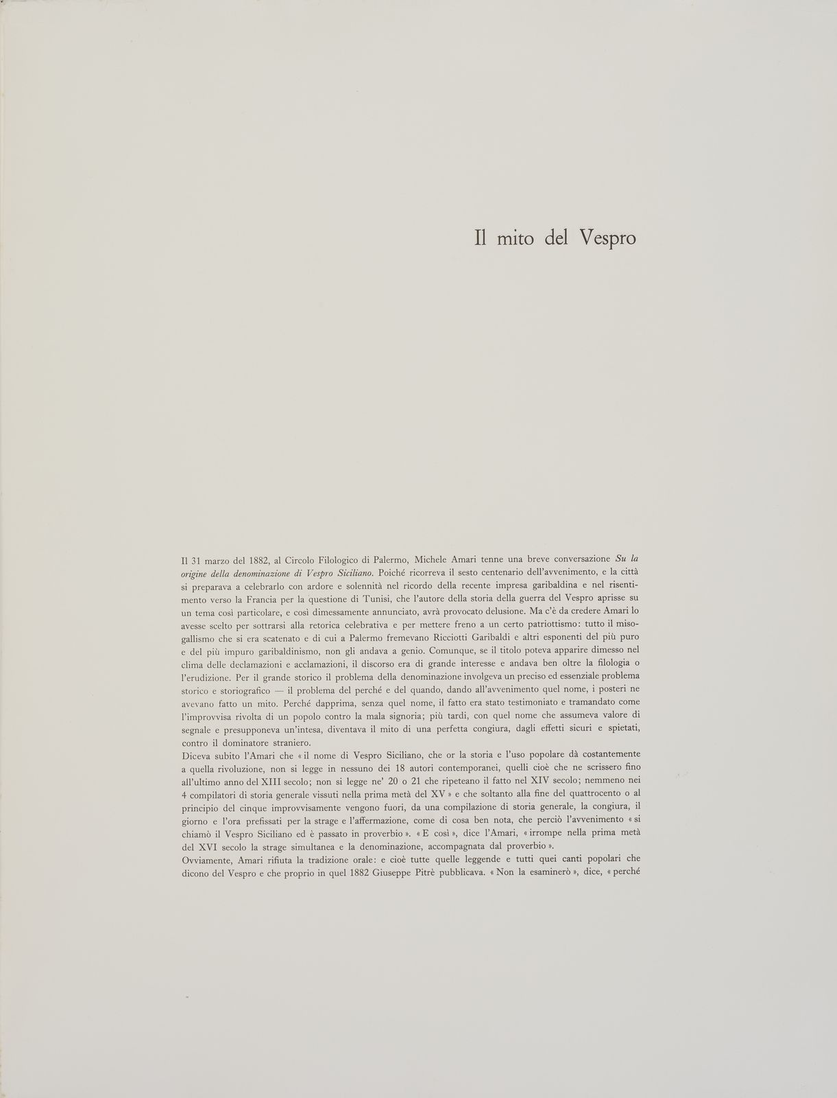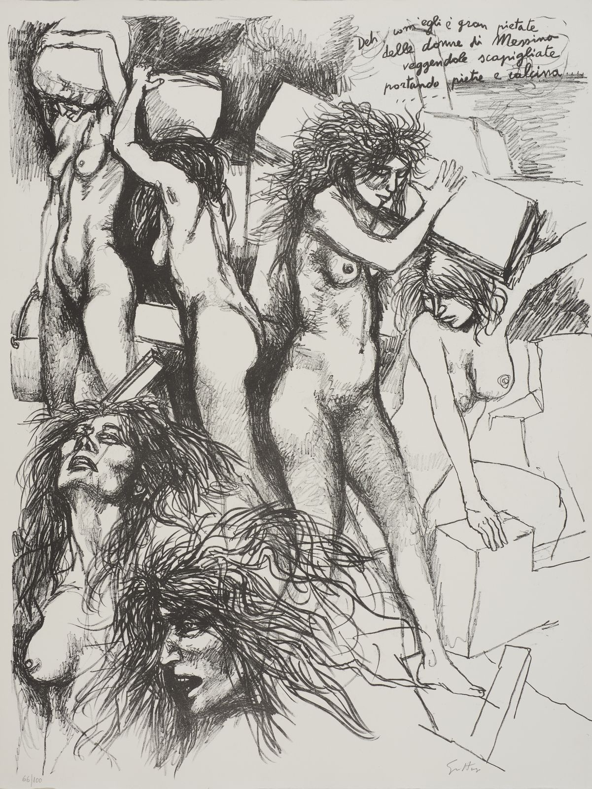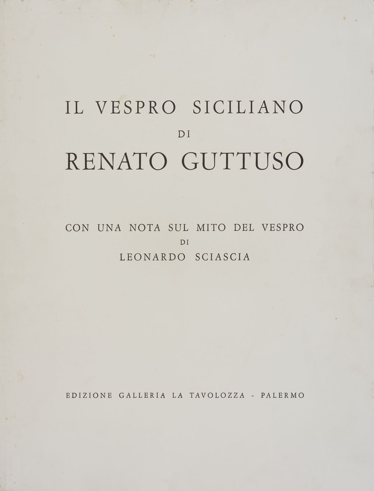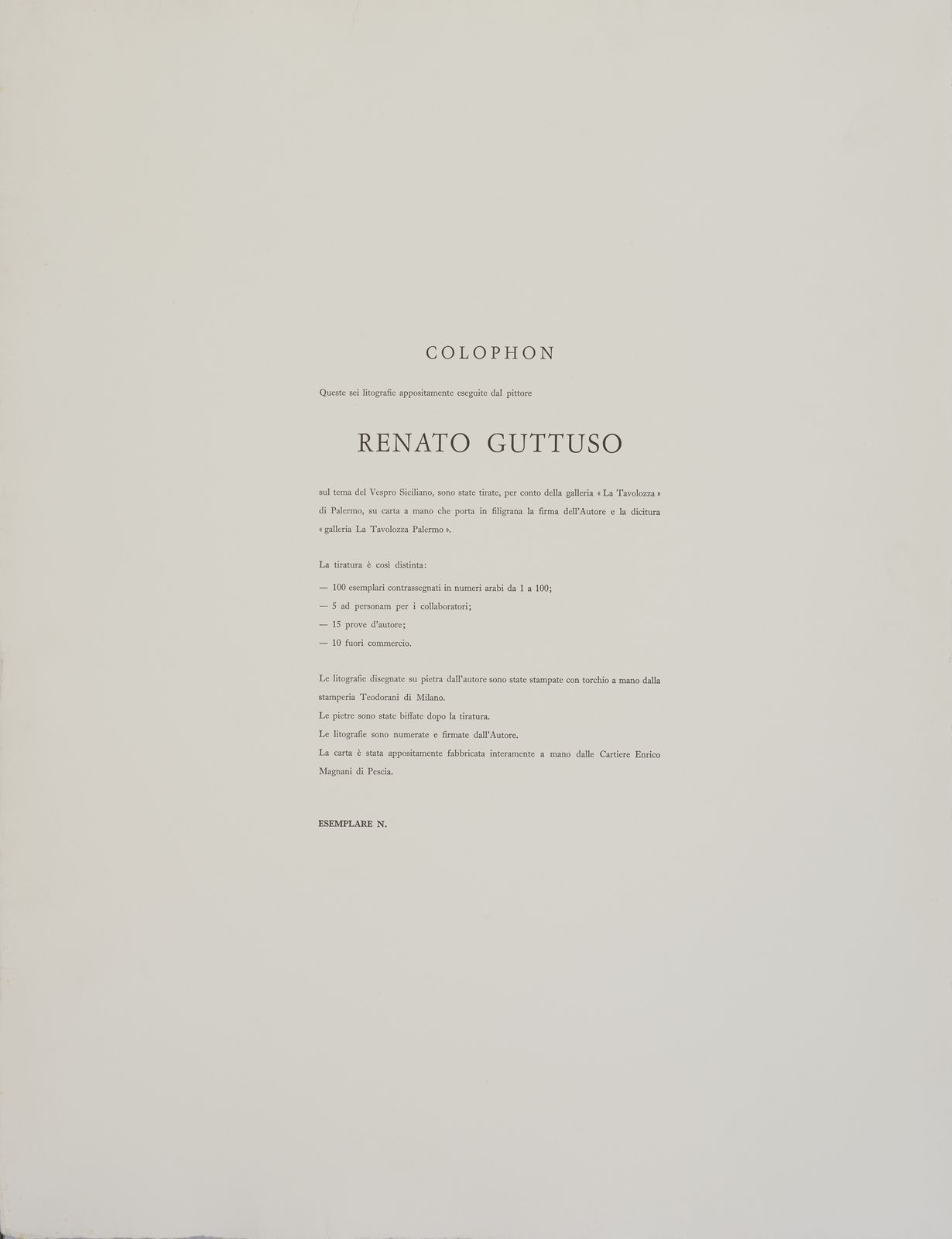 66/100. Ogni foglio presenta tiratura e firma in basso matita. Cartella composta da n. 6 litografie di Renato Guttuso e un testo di Leonardo Sciascia. Editore: Galleria La Tavolozza, Palermo. Stampatore: Teodorani, Milano. Carta Cartiere Enrico Magnani, Pescia. Edizione totale: 100 esemplari in numeri arabi + 5 esemplari ad personam per i collaboratorii + 15 prove d'artista + 10 esemplari fuori commercio. Pubblicazioni: Catalogo Bolaffi Grafica n.6, 1975, dal n.111895 al n.111900. Guttuso opera grafica, a cura di Paolo Bellini, prefazione di Giorgio Soavi, Club Amici dell'Arte Editore, Milano, 1978, p.132, n.309. Lievi difetti,