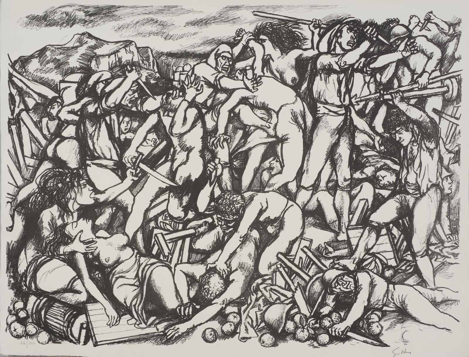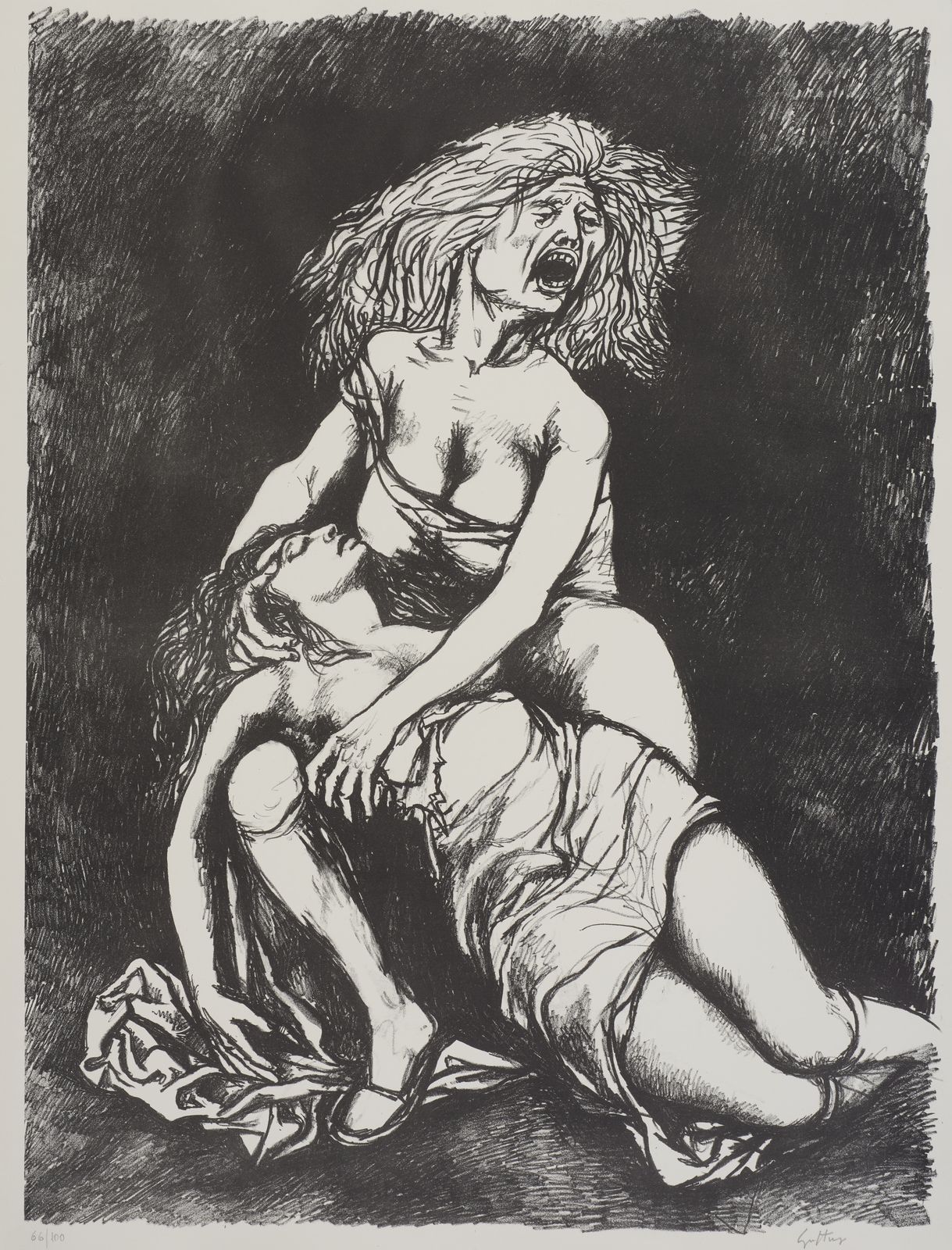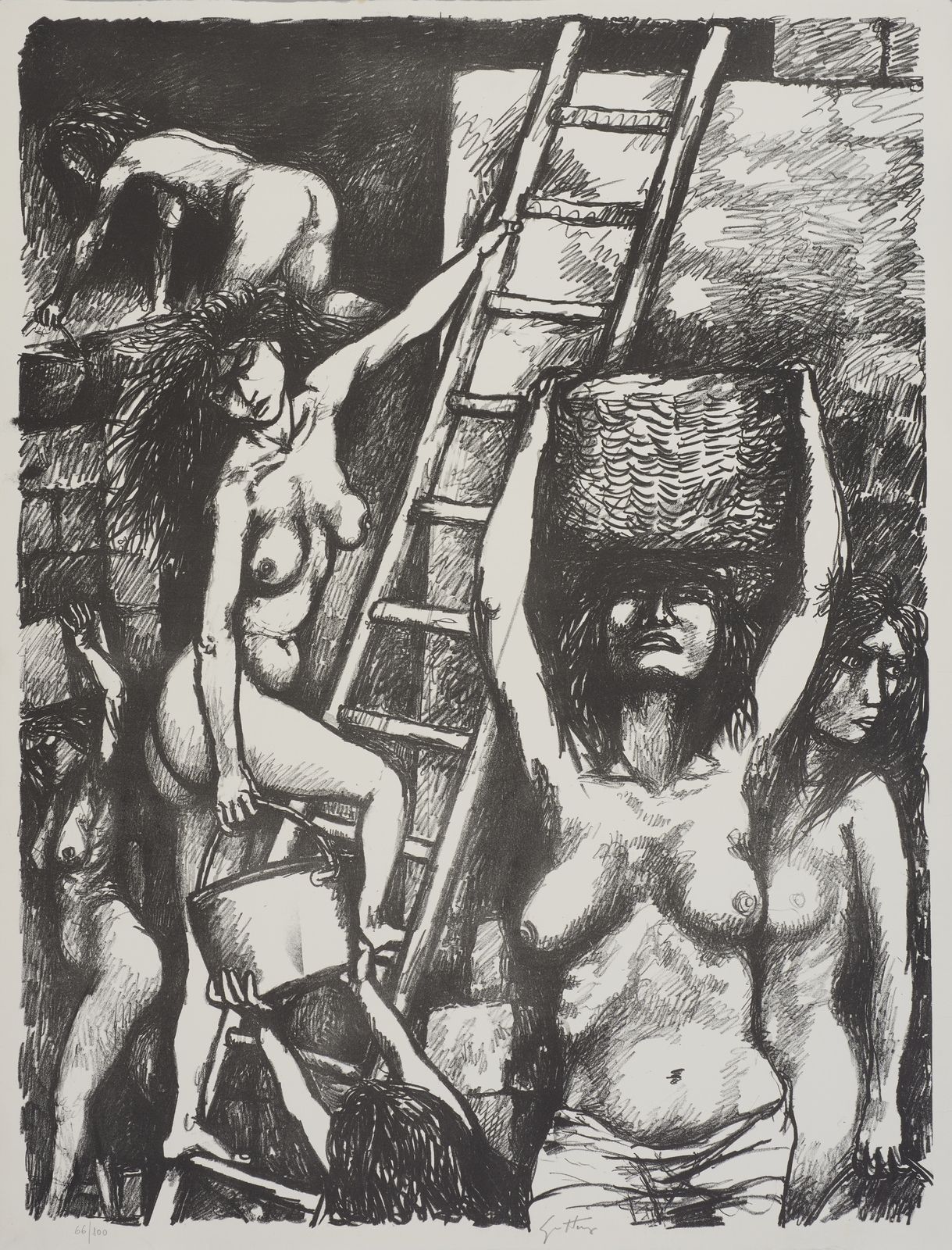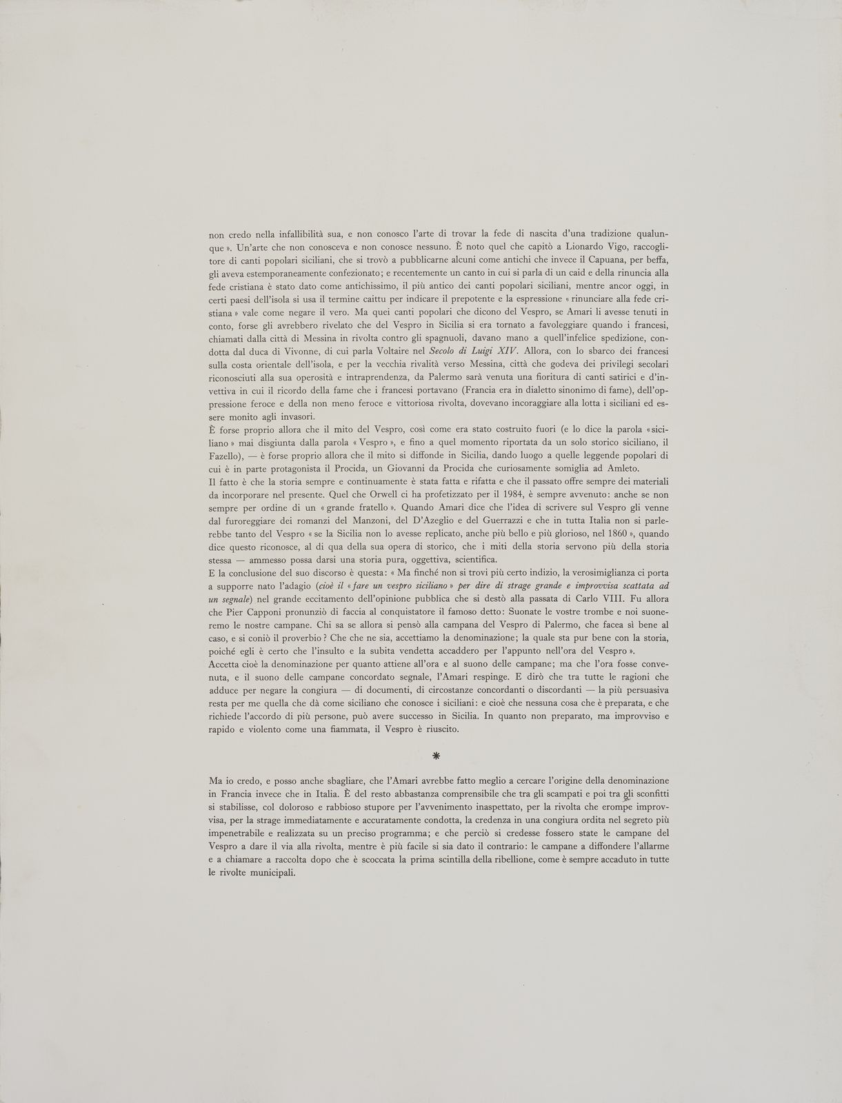 66/100. Ogni foglio presenta tiratura e firma in basso matita. Cartella composta da n. 6 litografie di Renato Guttuso e un testo di Leonardo Sciascia. Editore: Galleria La Tavolozza, Palermo. Stampatore: Teodorani, Milano. Carta Cartiere Enrico Magnani, Pescia. Edizione totale: 100 esemplari in numeri arabi + 5 esemplari ad personam per i collaboratorii + 15 prove d'artista + 10 esemplari fuori commercio. Pubblicazioni: Catalogo Bolaffi Grafica n.6, 1975, dal n.111895 al n.111900. Guttuso opera grafica, a cura di Paolo Bellini, prefazione di Giorgio Soavi, Club Amici dell'Arte Editore, Milano, 1978, p.132, n.309. Lievi difetti,