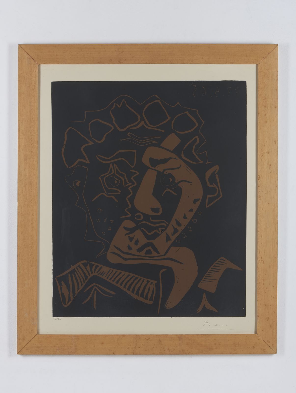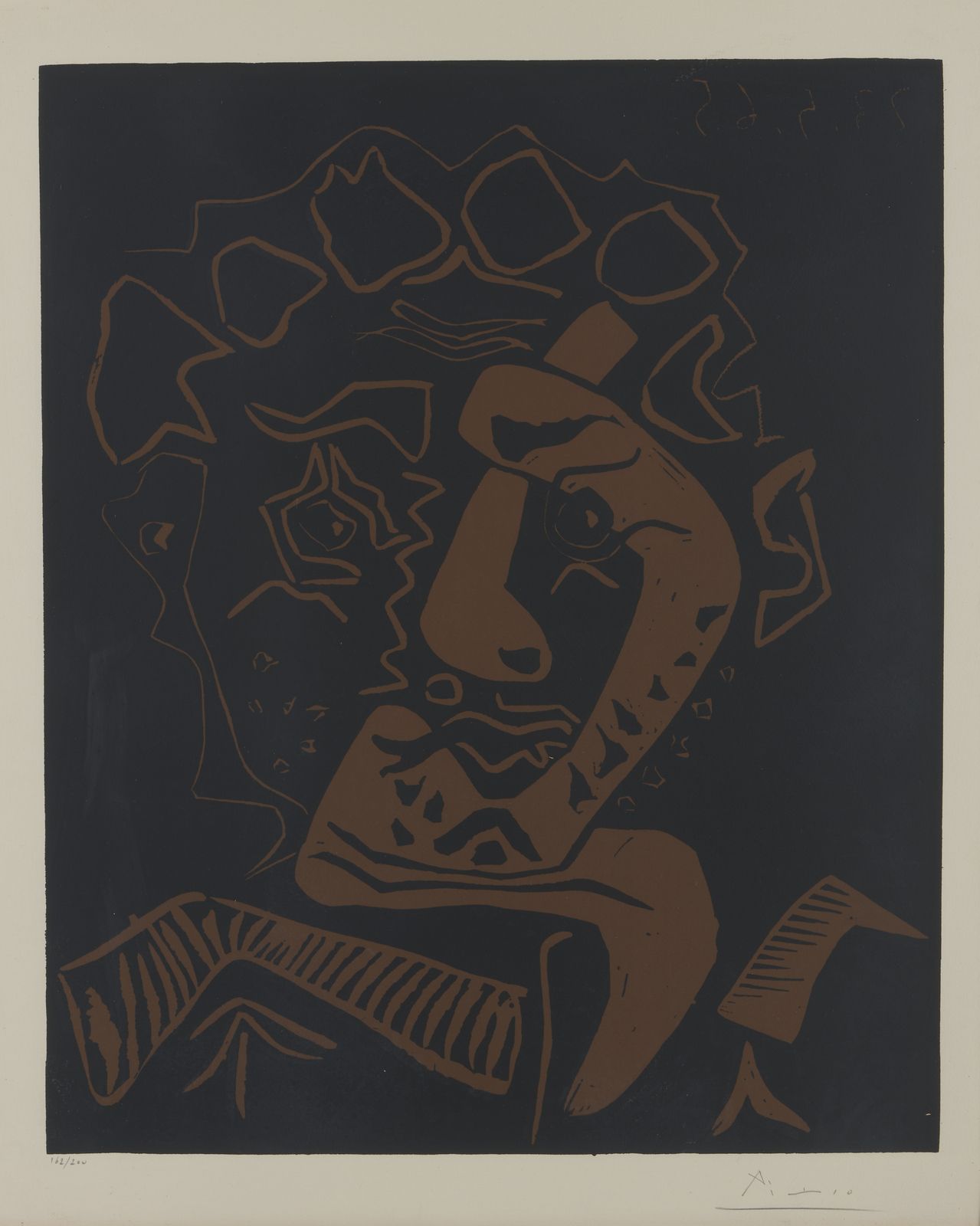 162/200. Tiratura e firma in basso a matita. Anno in alto a destra a lastra. Al retro cartiglio Galerie Maeght, Parigi. Realizzata per l'esposizione Picasso et le Théâtre, Tolosa, Musée des Augustins, giugno - settembre 1965. Edizione totale: 200 esemplari. Editore: Musée des Augustins, Toulouse. Pubblicazioni: Picasso, catalogue de l'oeuvre gravé et lithographié, Tome II, 1966-1969, G. Bloch, edizioni Kornfeld et Klipstein, Berna, 1971 , n°1849. Picasso Peintre-Graveur. Tome VI. Catalogue raisonné de l'oeuvre gravé et lithographié et des monotypes. 1966 - 1968, B. Baer, ed. Bern Kornfeld 1994 n° 1360 (cfr. addendum Tomo V). Provenienza: Collezione Lana, Milano.