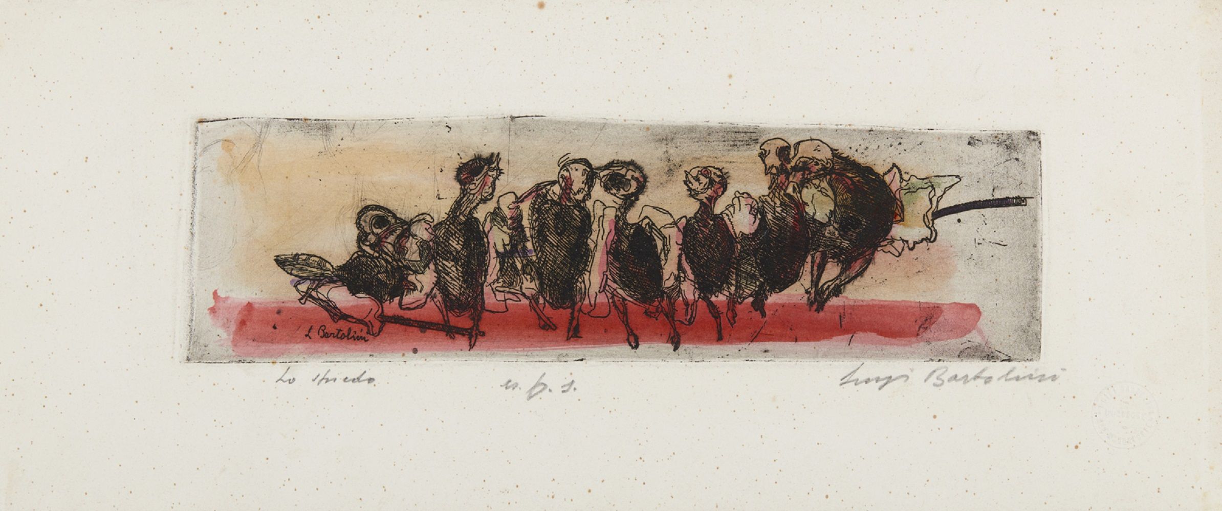 6/10. Tiratura, titolo e firma in basso a matita. Firma in lastra in basso a sinistra.Timbro a secco Luigi Bartolini incisiore in basso a destra. Dimensione lastra: 8.5x29 cm. Difetti.