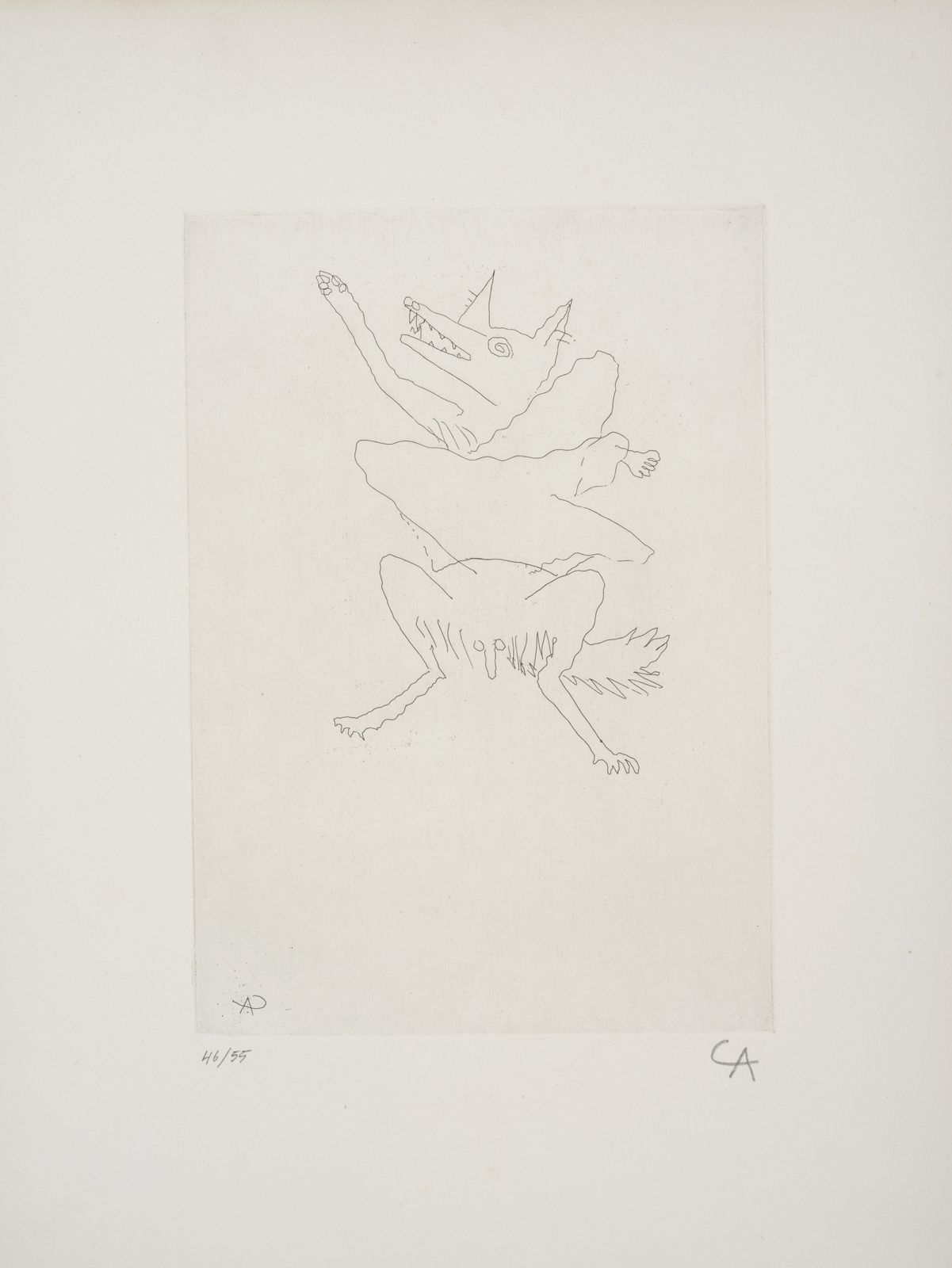 45/55. Tiratura e firma monogrammata in basso a matita. Firma a lastra in basso a sinistra. Filigrana Arches. Dimensione lastra: 29.8x16.6 cm. Editore e stampatore: Le Soleil Noir/Lacourière, Paris. Lievi difetti.