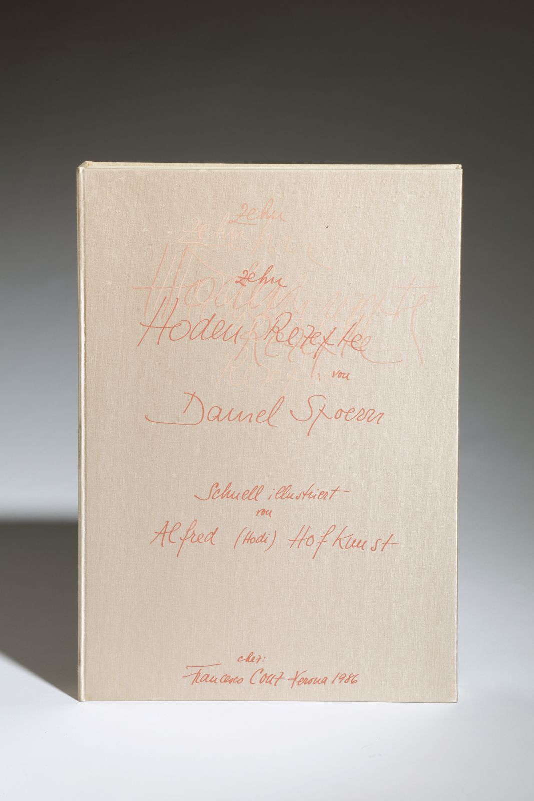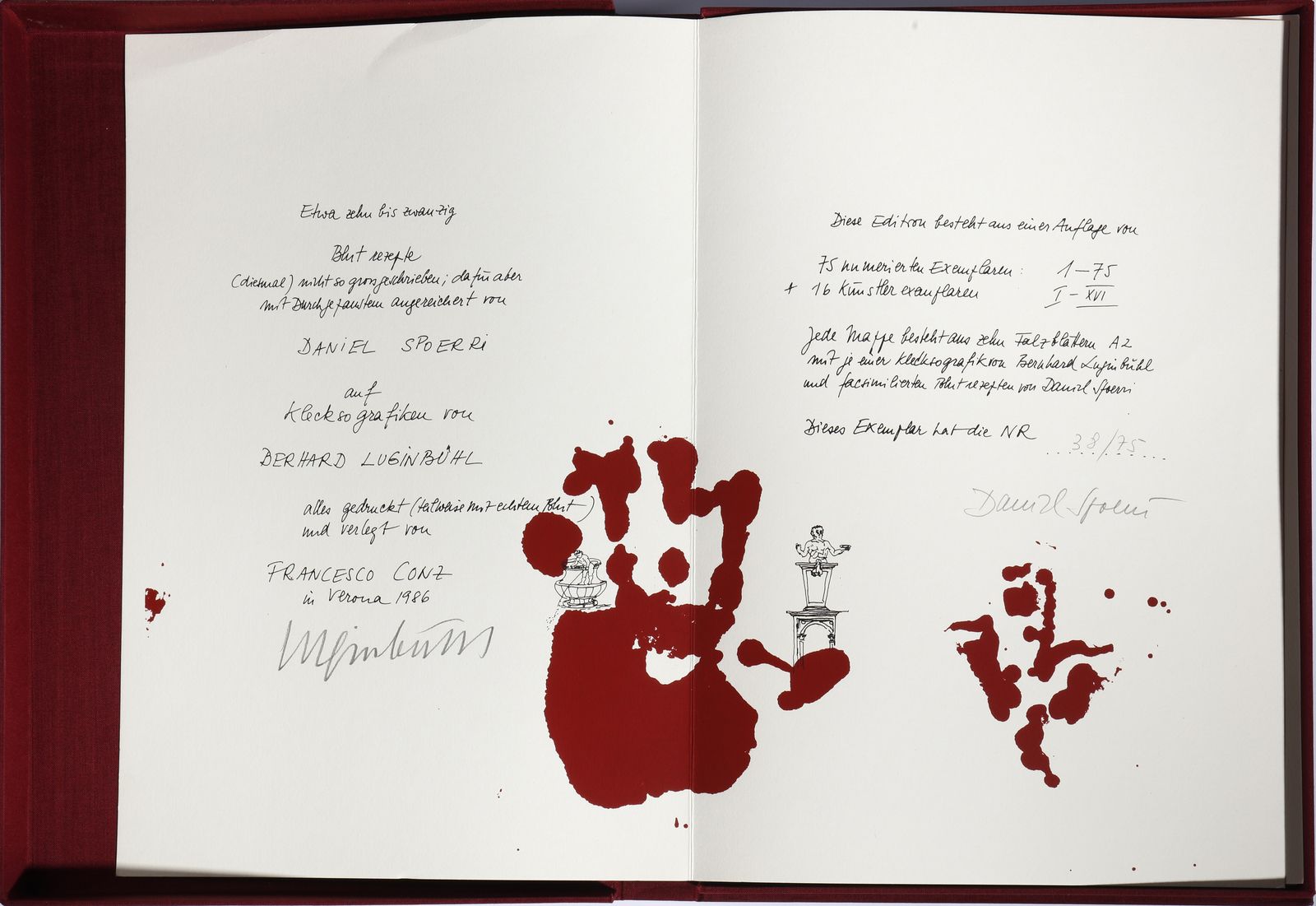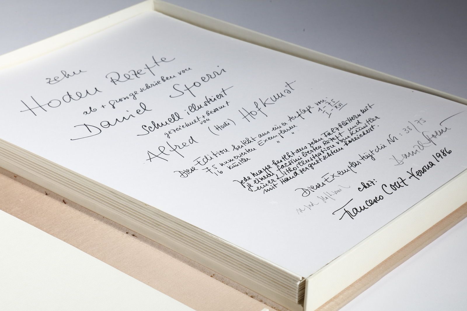 38/75. Ogni foglio presenta la firma di Topor in basso a matita. Firma a matita di Daniel Spoerri all'interno della copertina. Il lotto è composto da quattro dei dieci libri d'artista di ricette raccolte, trascritte e annotati da Daniel Spoerri, ognuno dedicato a un ingrediente specifico. Editore Francesco Conz e Daniel Spoerri. Portafogli illustrati da Attersee, Blume, Hofkunst, Luginbuehl, Schroer, Schwegler, Topor , Duwen, Gerstners e Roth. Edizione totale: 75 Esemplari numerati da 1/75 a 75/75. 16 esemplari numerati da I/XVI a XVI/XVI. Presente copertina originale.