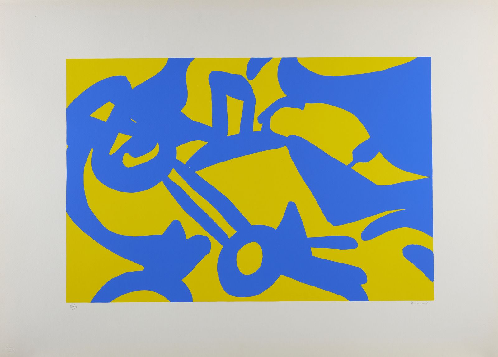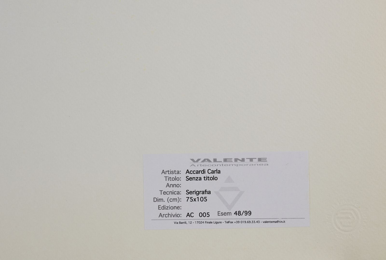 48/99. Tiratura e firma in basso a matita. Dimensioni lastra: cm 51x76. Timbro a secco - Stamperie Carafiser, Roma - in basso a sinistra. Al retro cartiglio descrittivo Valente Arte Contemporanea, Finale Ligure. Lievi difetti.