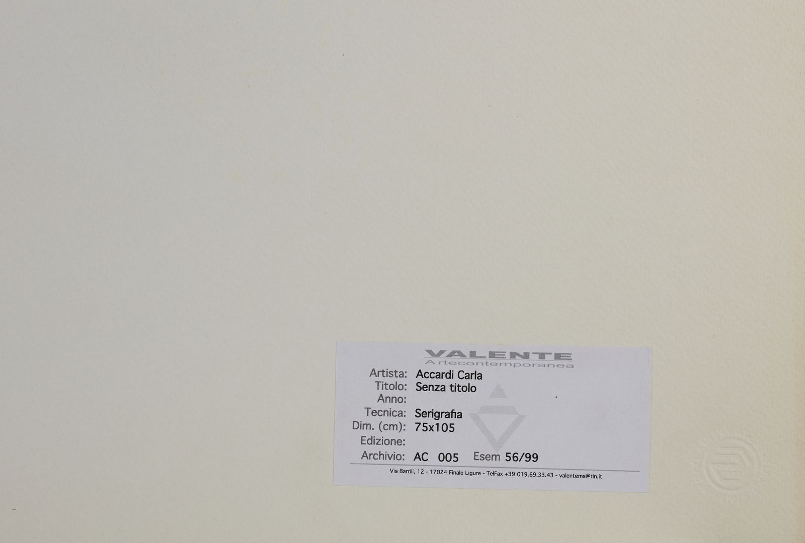 56/99. Tiratura e firma in basso a matita. Dimensioni lastra: cm 51x76. Timbro a secco - Stamperie Carafiser, Roma - in basso a sinistra. Al retro cartiglio descrittivo Valente Arte Contemporanea, Finale Ligure. Lievi difetti.