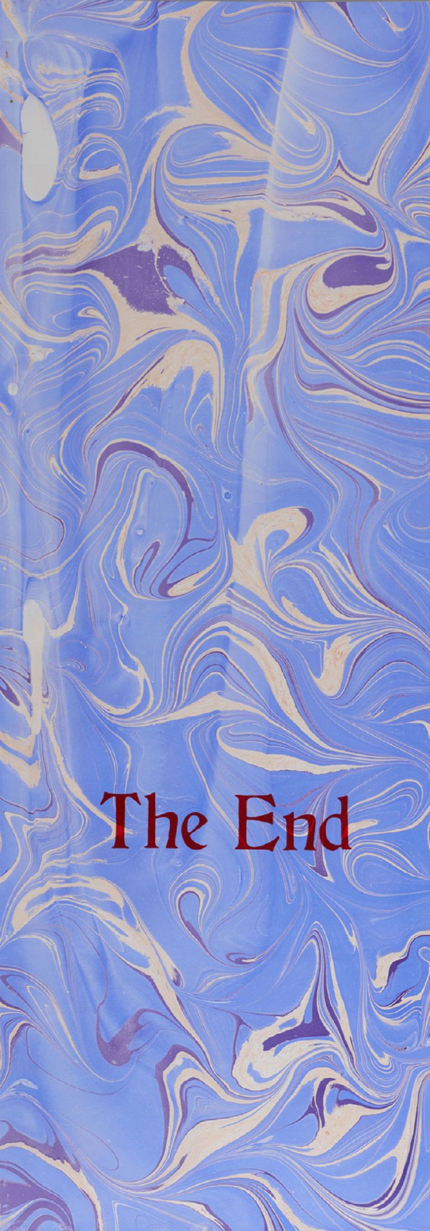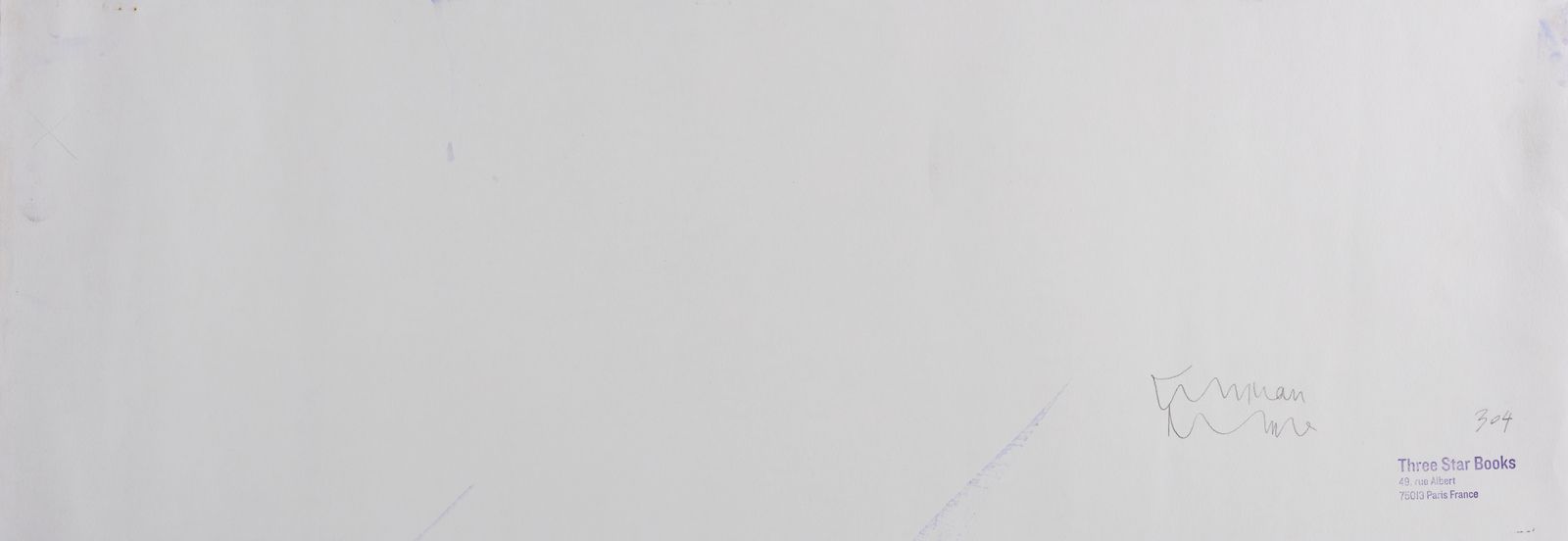 Al retro firma e timbro Three Star Books, Parigi. Serigrafia su carta marmorizzata. Il volume realizzato per Three Star Books,“The End”, è serigrafato sulle pagine. Il testo scorre sulla carta marmorizzata lungo le ventiquattro pagine stampate del libro imitando i ventiquattro fotogrammi di un secondo dei titoli di coda di un film.Lievi difetti.