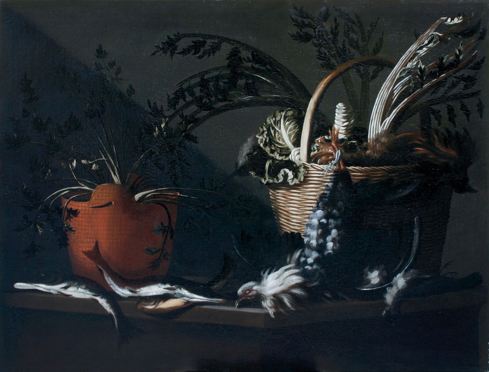 Interno di cucina con pesci, cacciagione e ceste di ortaggi