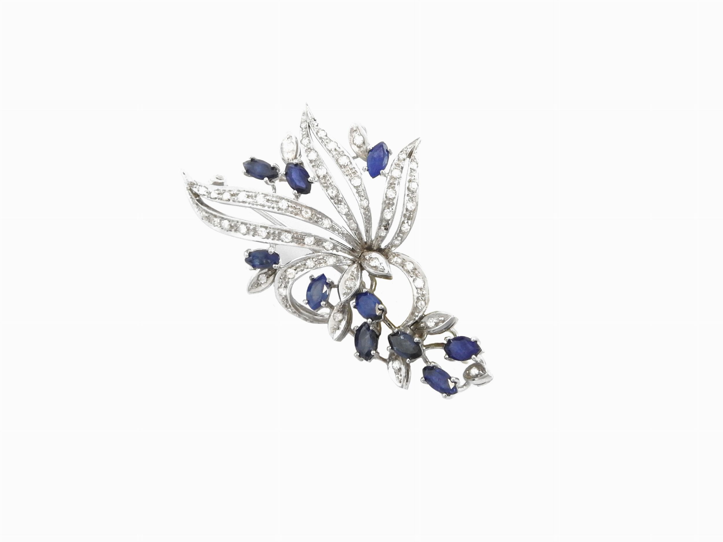 Demi parure spilla e orecchini in oro bianco con diamanti e zaffiri