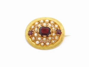 Una spilla e un pendente in oro giallo con smalti policromi e microperle