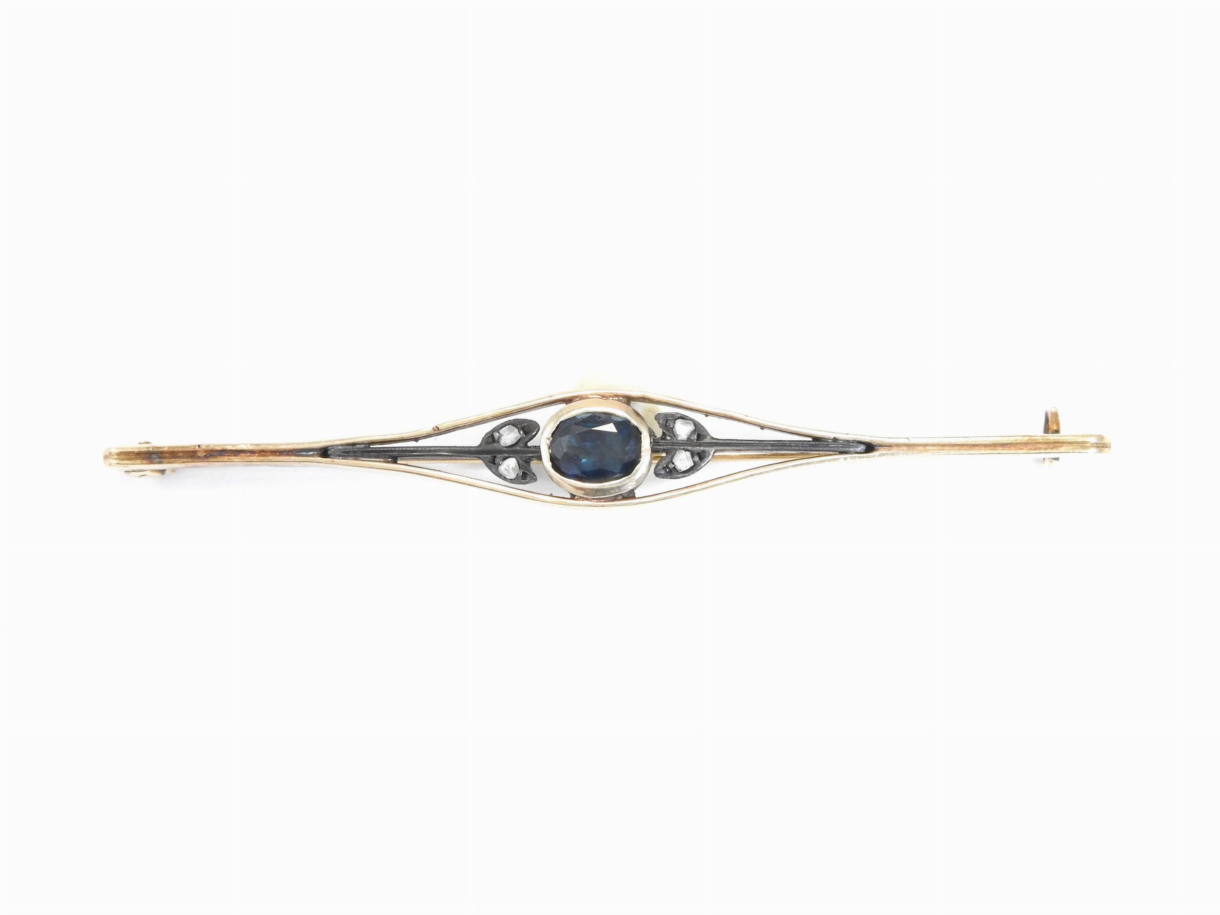 Spilla a barretta in oro rosa 500/1000 e argento con diamanti e zaffiro