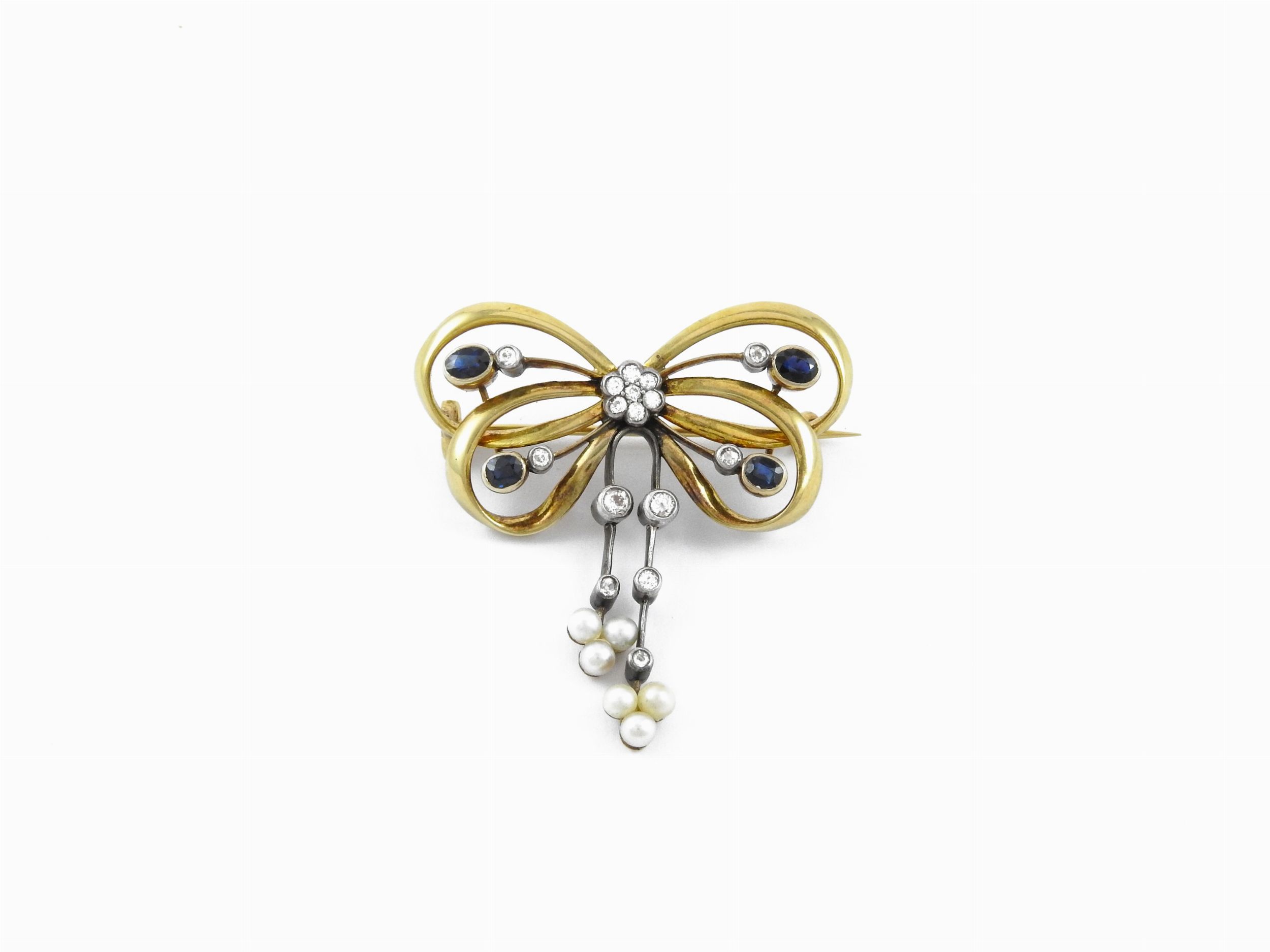 Spilla in oro giallo e argento con diamanti, zaffiri e perle