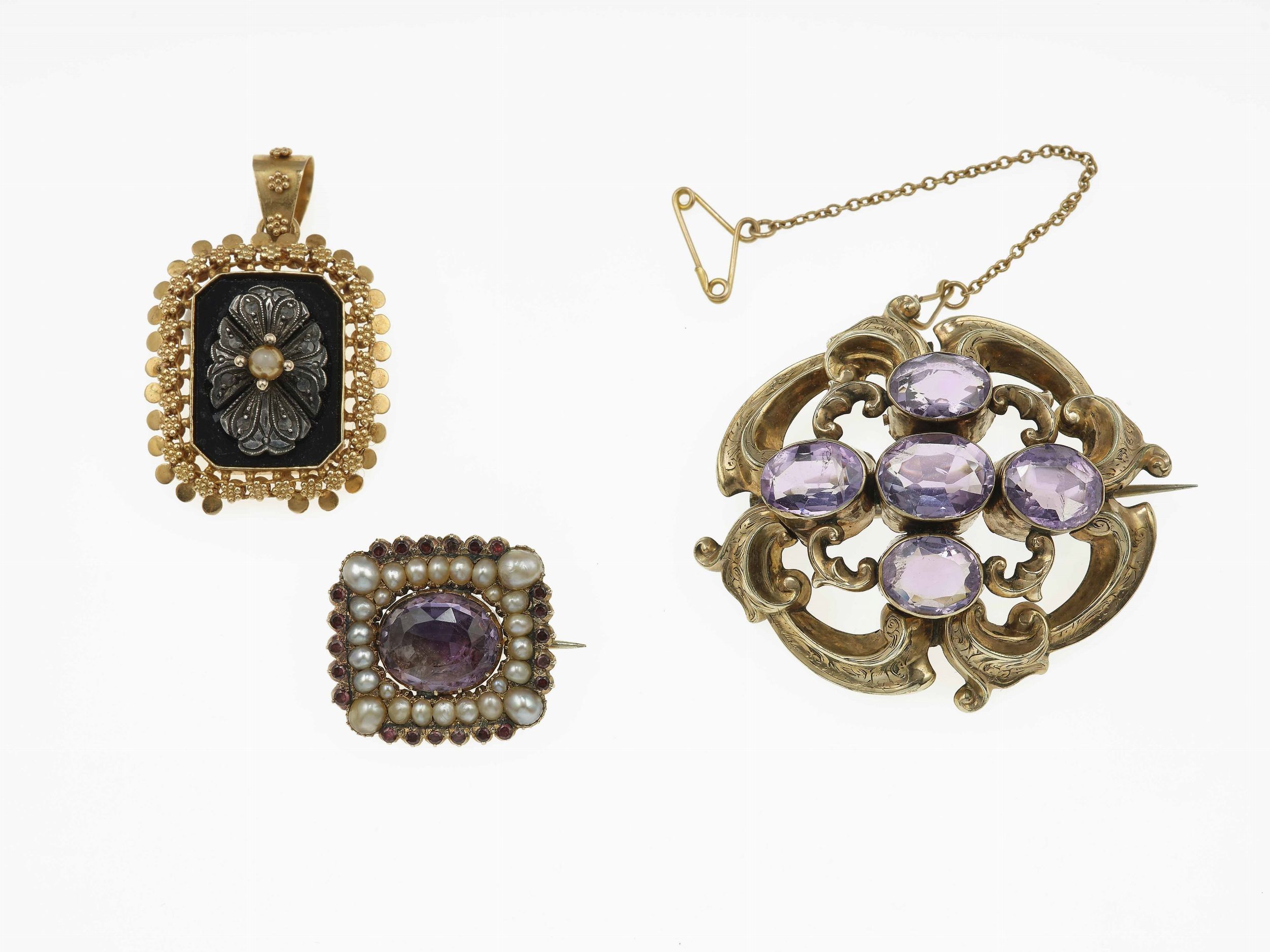 Due spille e un pendente con ametiste e perle