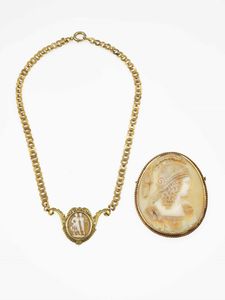 Lotto composto da spilla e girocollo con cammeo su conchiglia