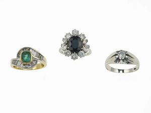 Lotto costituito da tre anelli con diamanti, zaffiro e smeraldo