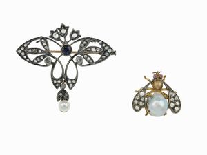 Lotto costituito da due spille con perle e rosette di diamanti