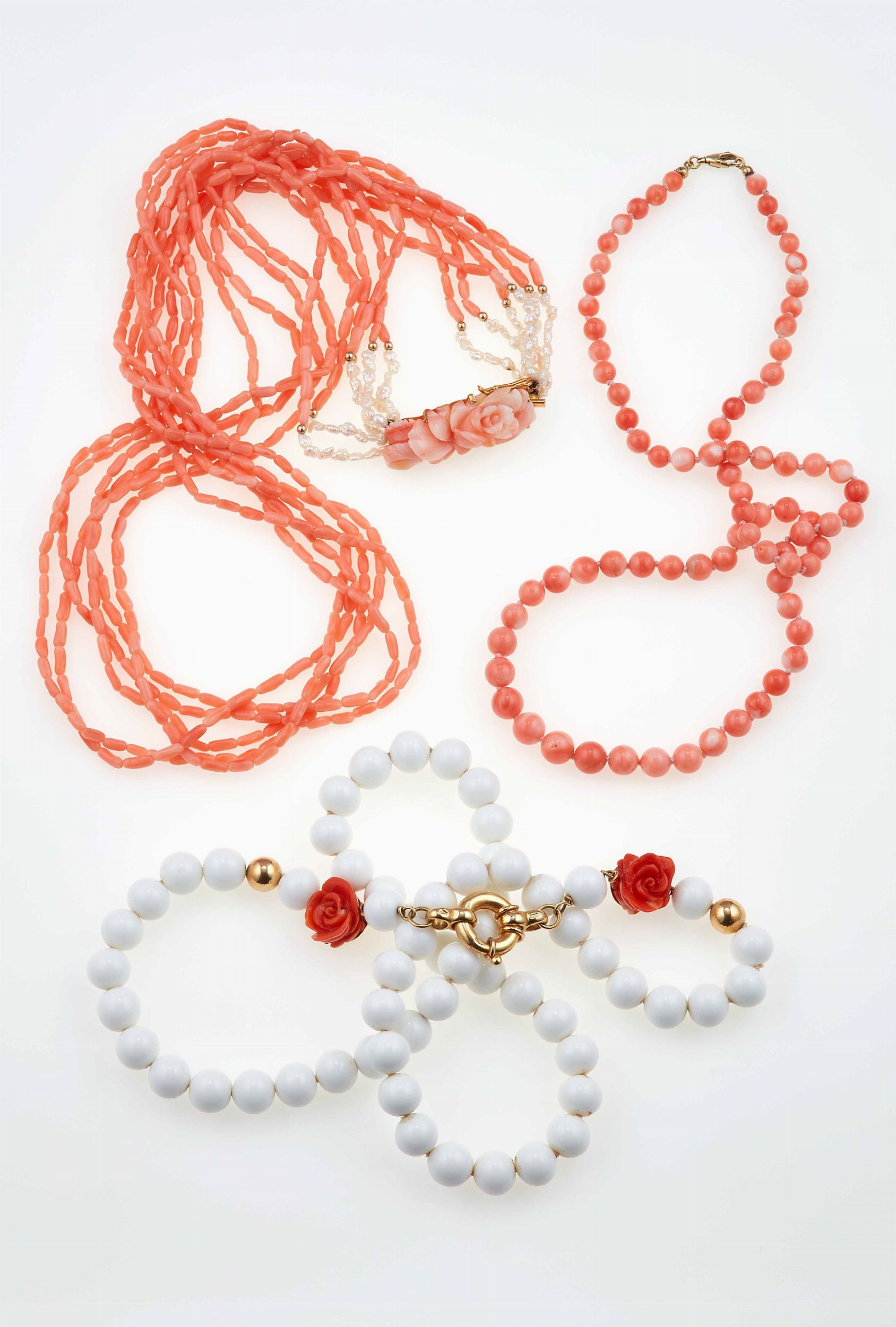 Lotto composto da tre collane con corallo, calcedonio bianco e perline