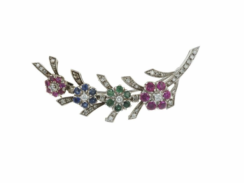 Spilla con fiori in diamanti, zaffiri, rubini e smeraldi