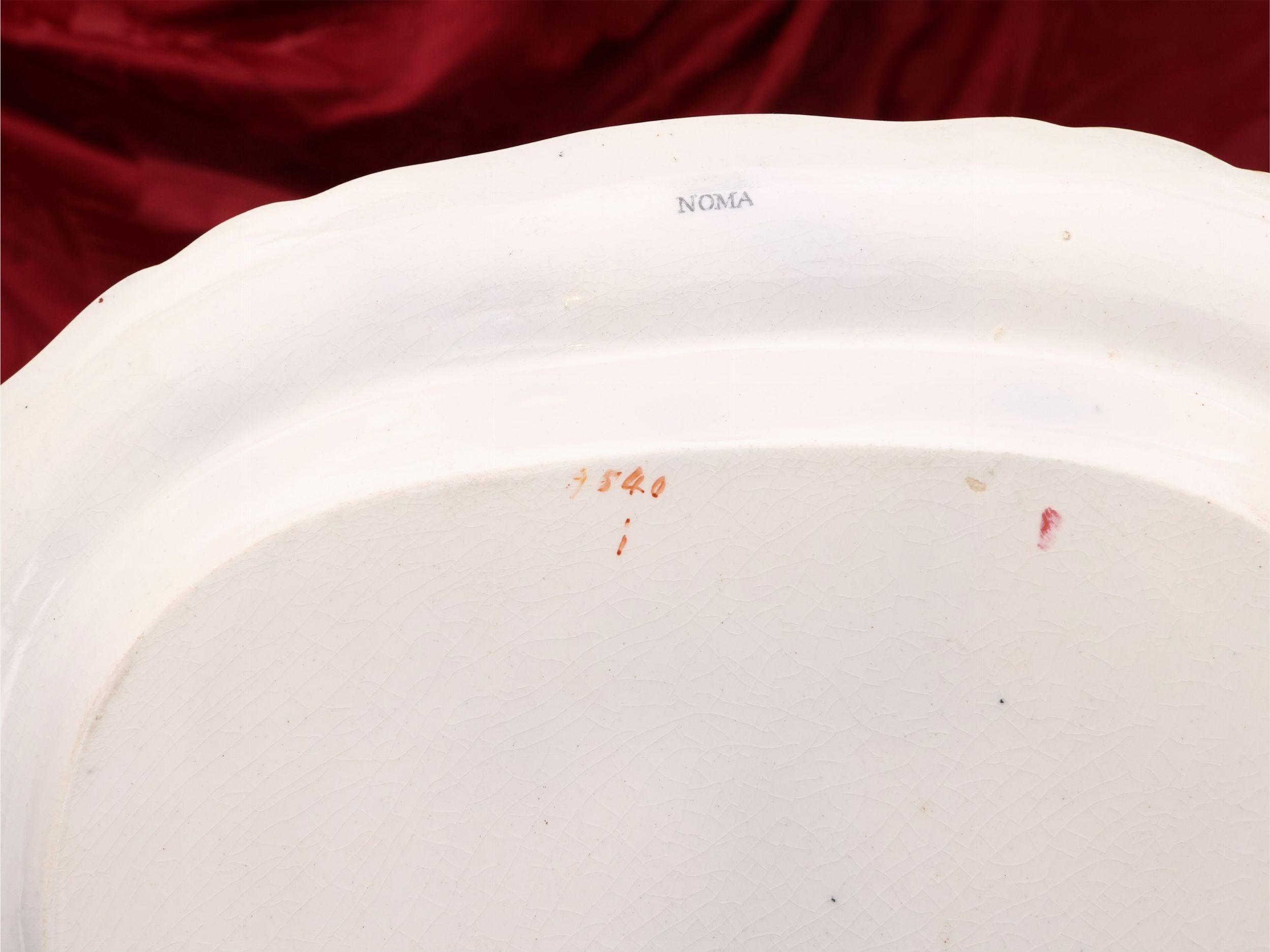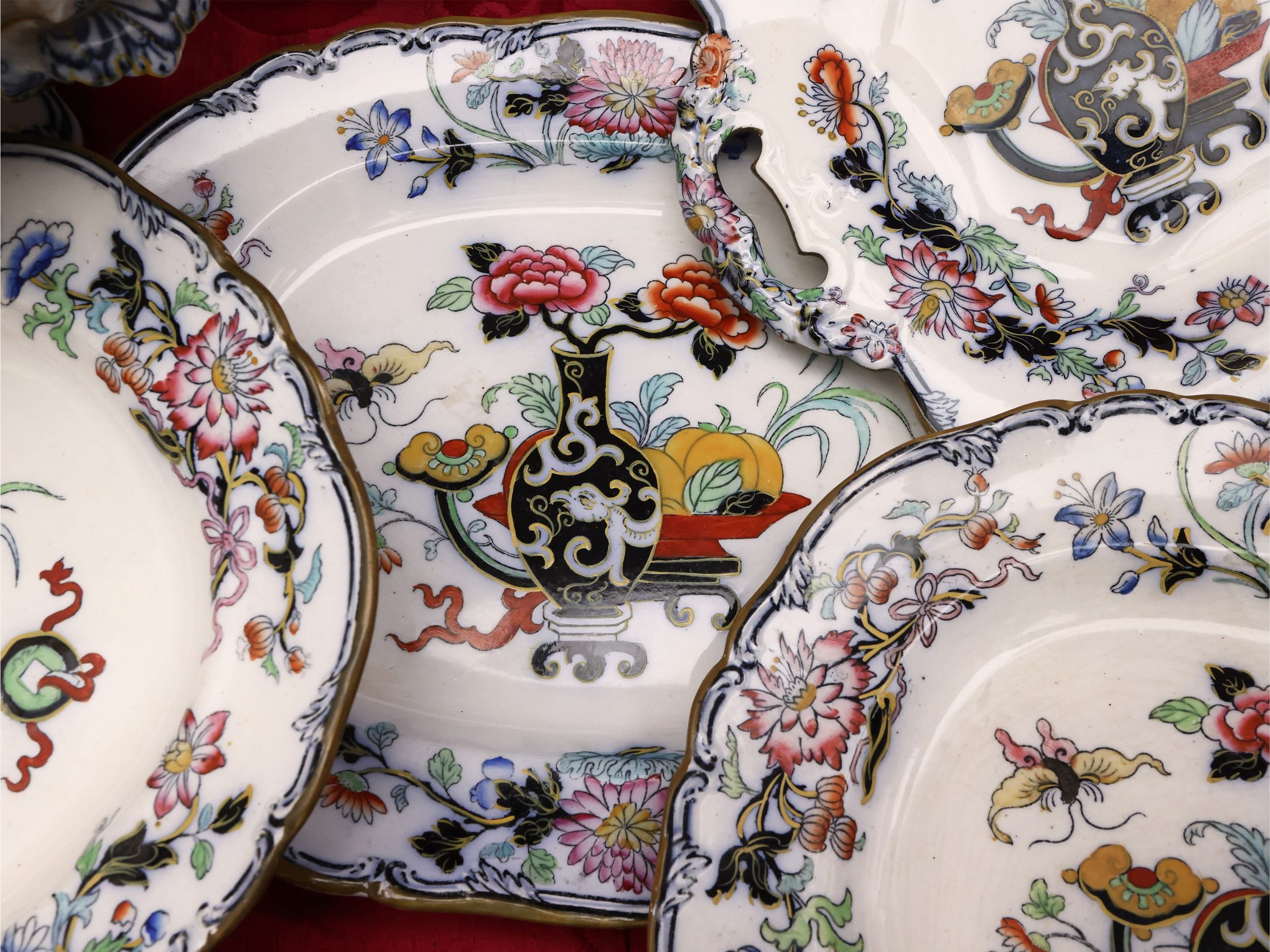 zuppiera h cm 25x34x20 (10) seconda metà del XIX secolo dipinti a chinoiserie con vasi e peonie nei toni del blu, arancio e rosa, composto da grande zuppiera con vassoio, alzata, salsiera mancante del coperchio e sei vassoi di varie forme e tipologie, lievi difetti