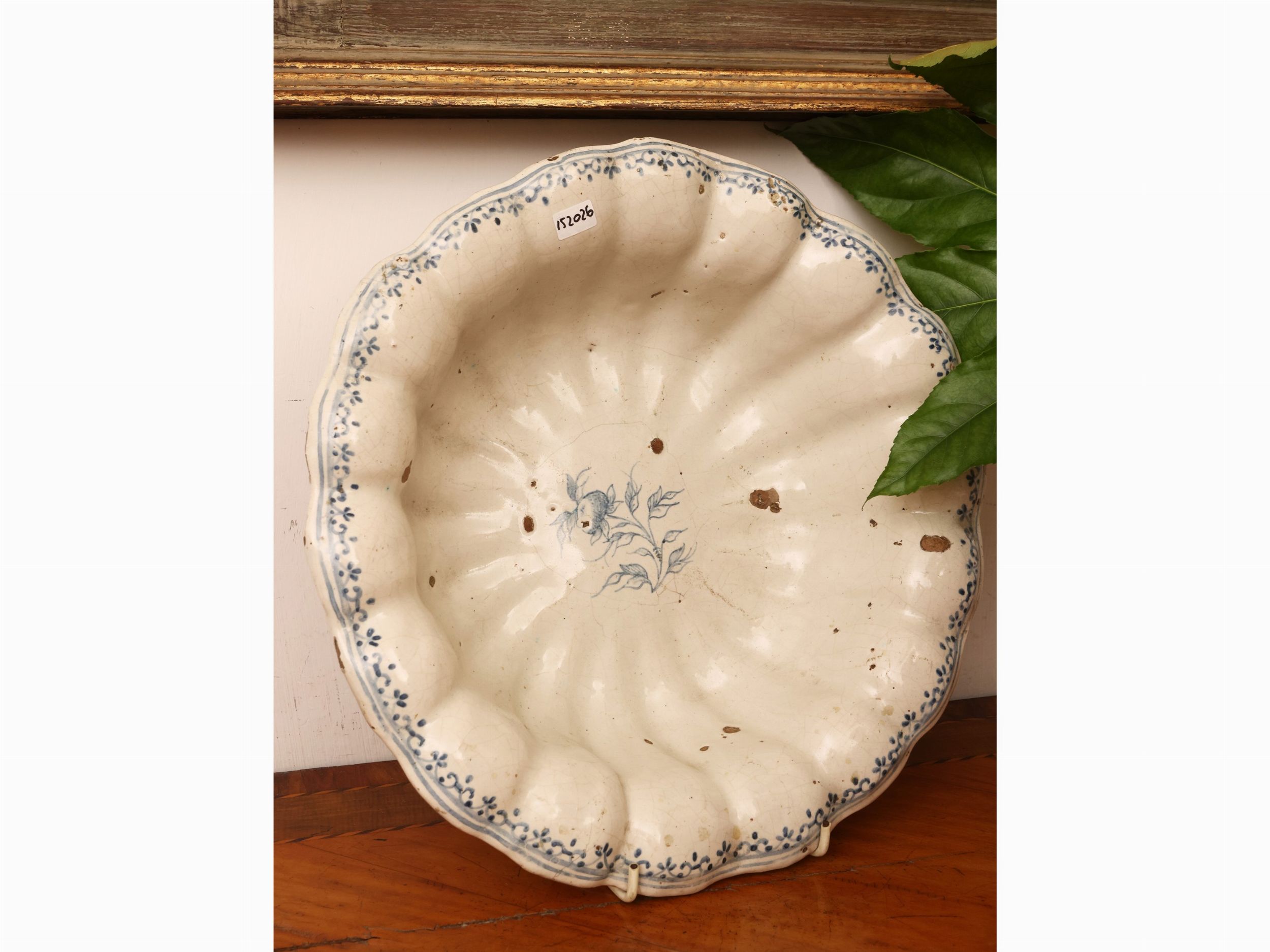 XVIII secolo di forma circolare baccellata, dipinto con motivi floreali in monocromia celeste, alcuni difetti