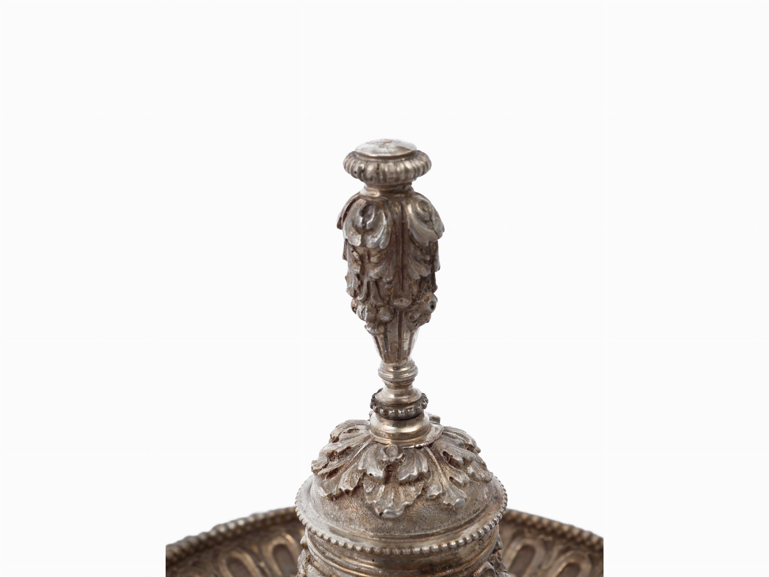 interamente cesellato e sbalzato con ghirlande d'alloro che circoscrivono scudi alternati a conchiglie, poggiante su base a piatto baccellata, orlo a foglie d'acanto, batacchio da riattaccare