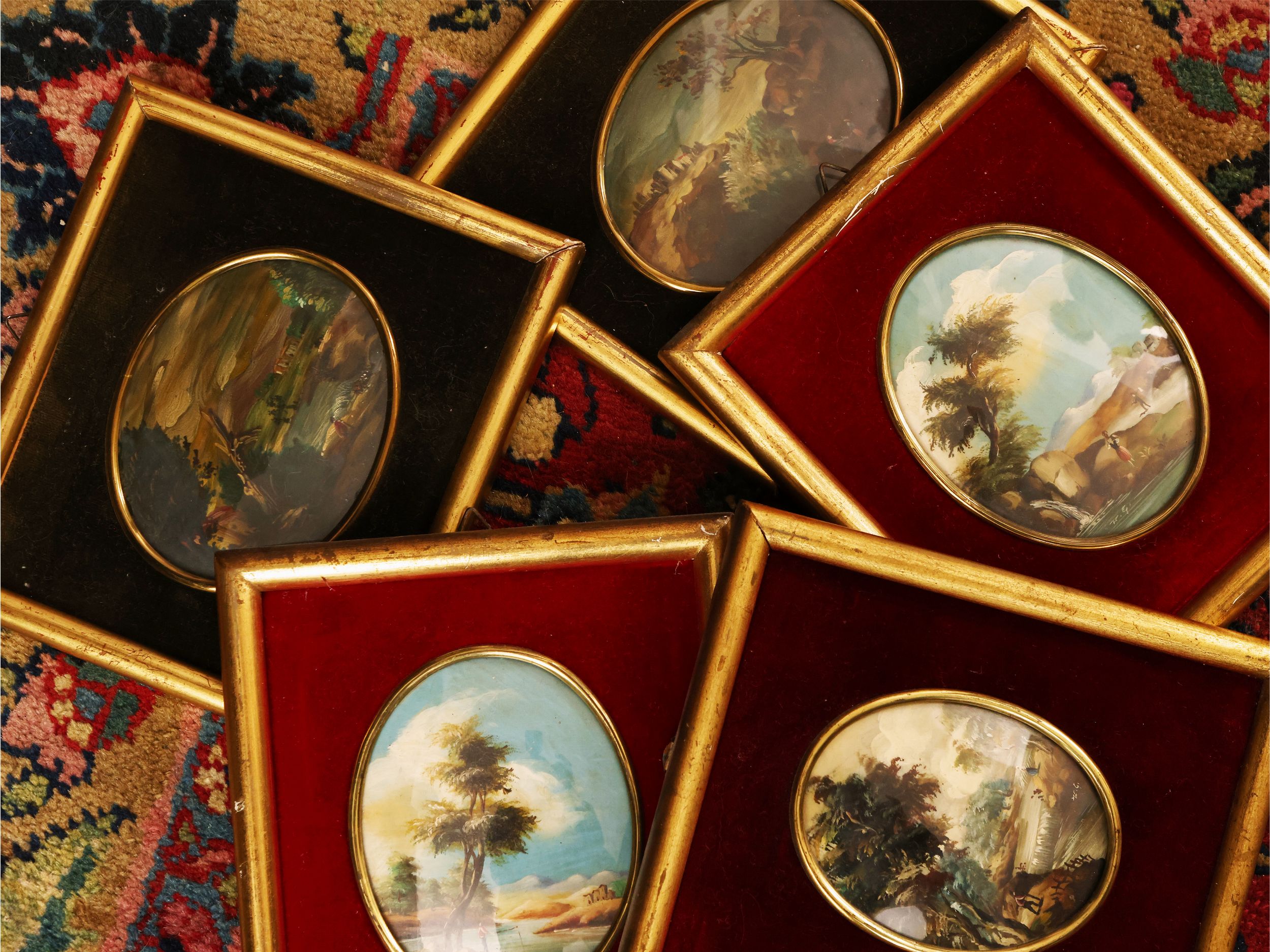 XX secolo raffiguranti paesaggi in ovale, in cornici in velluto e metallo