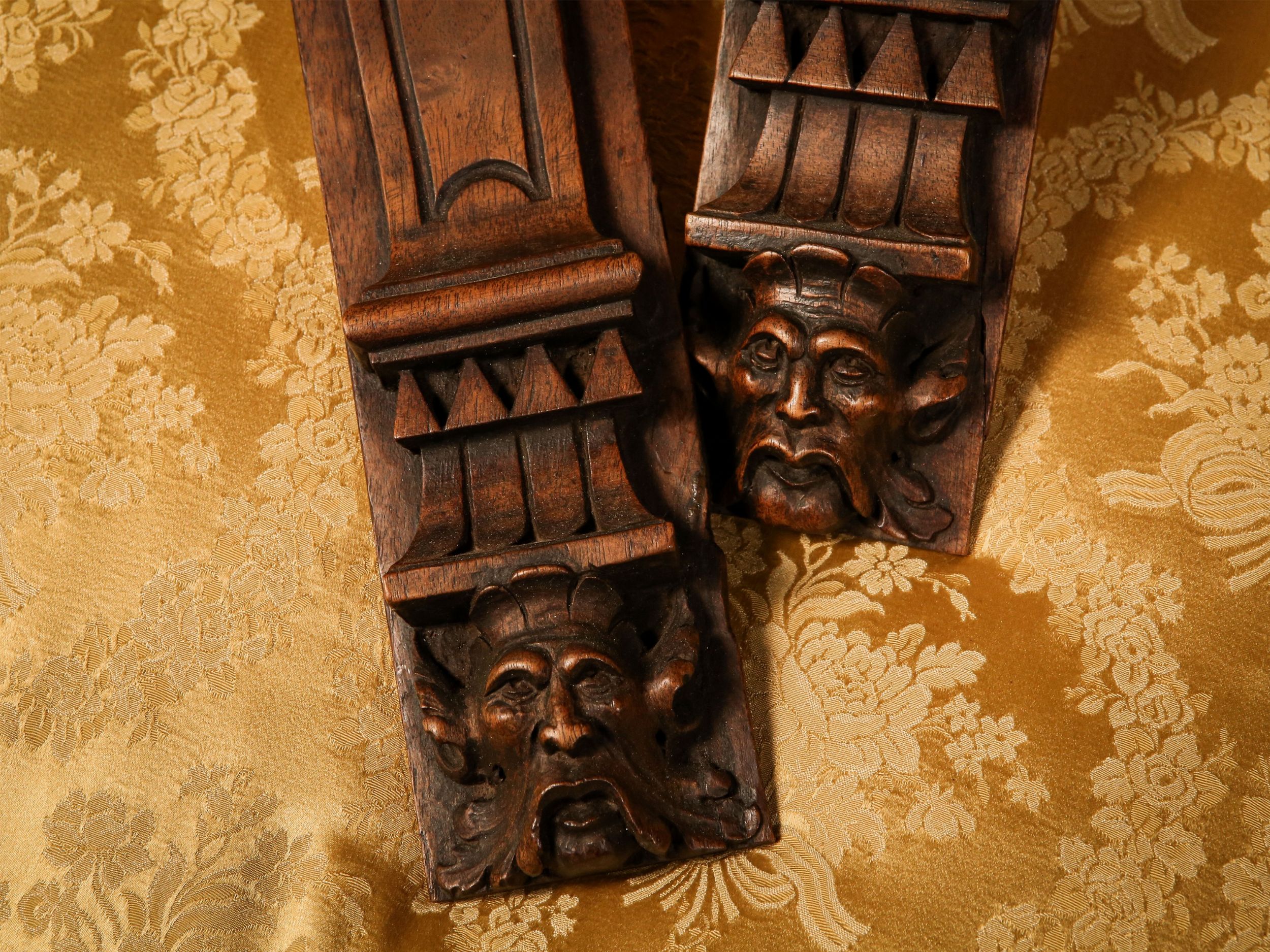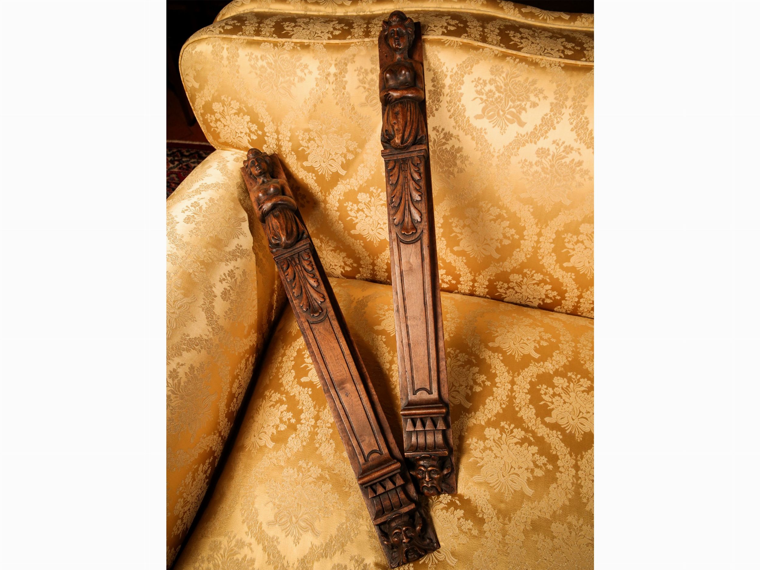 Coppia di elementi architettonici per mobilia in noce intagliato