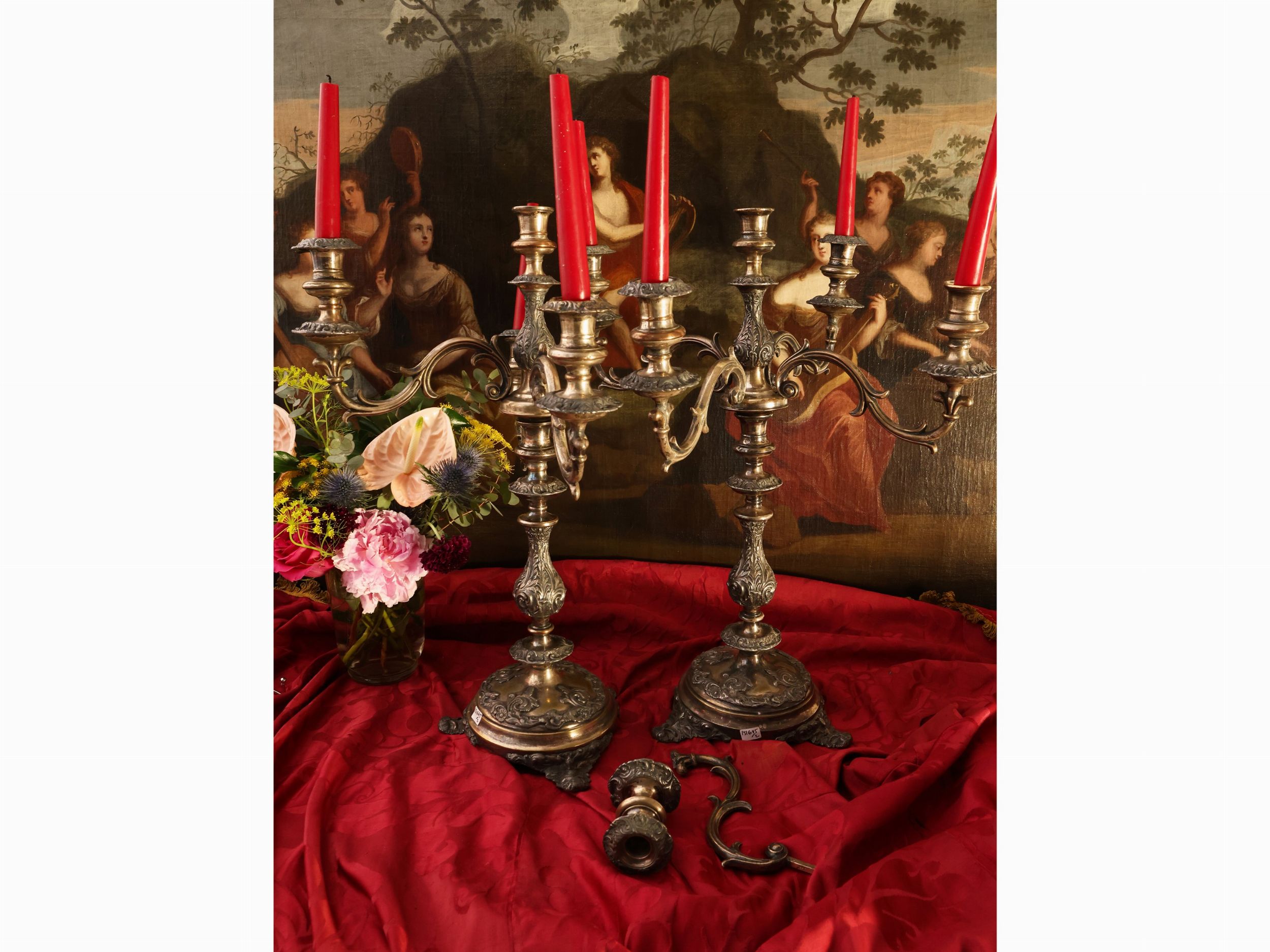 h cm 60, versione candelieri h cm 38 seconda metà del XIX secolo stelo sbalzato con motivi e volute vegetali e floreali, ciascuno con bobeche centrale e quattro bracci a doppia voluta (un braccio da restaurare), trasformabili in candelieri, alcuni difetti