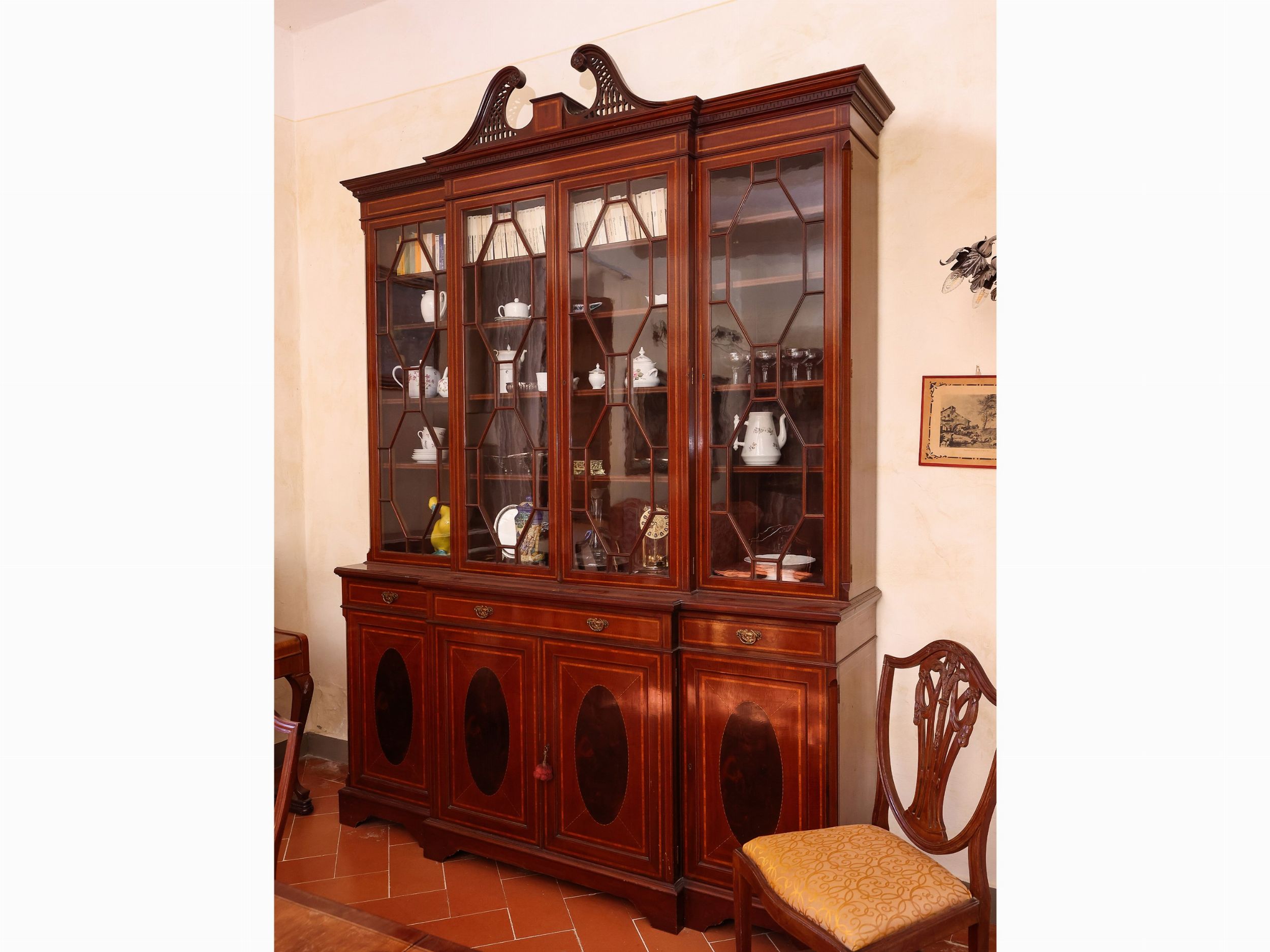 h cm 275x200x50 Inghilterra, fine del XIX/inizio del XX secolo intarsiata con filettature in legno di frutto, cimasa con volute contrapposte traforate, quattro sportelli a vetri soffiati con cornici geometriche nella parte superiore, tre cassetti e quattro sportelli intarsiati con cornici ovoidali in quella inferiore, piedi a mensola