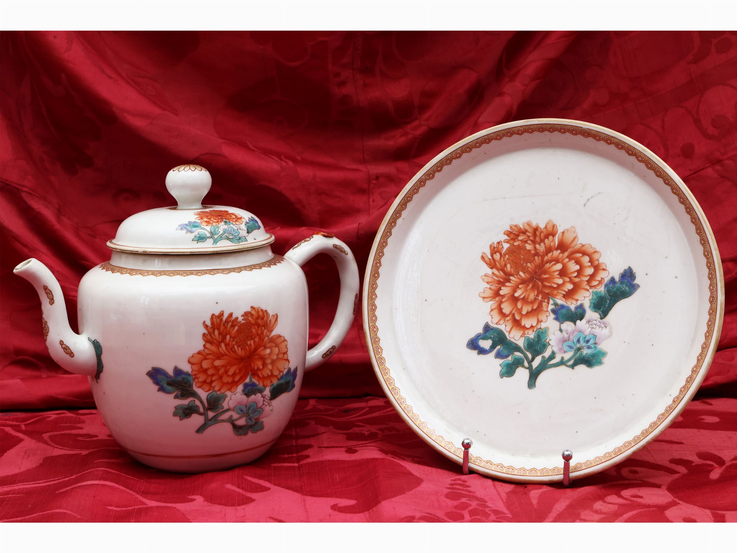 Cina, XIX/XX secolo dipinta con peonia e lumeggiature dorate, corredata da piatto en pendant