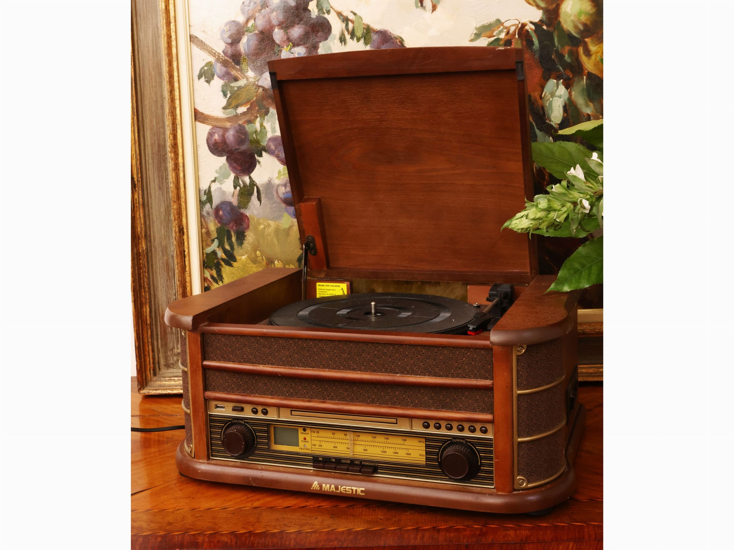 di gusto vintage, in legno, con giradischi, radio e lettore cd, possibili difetti