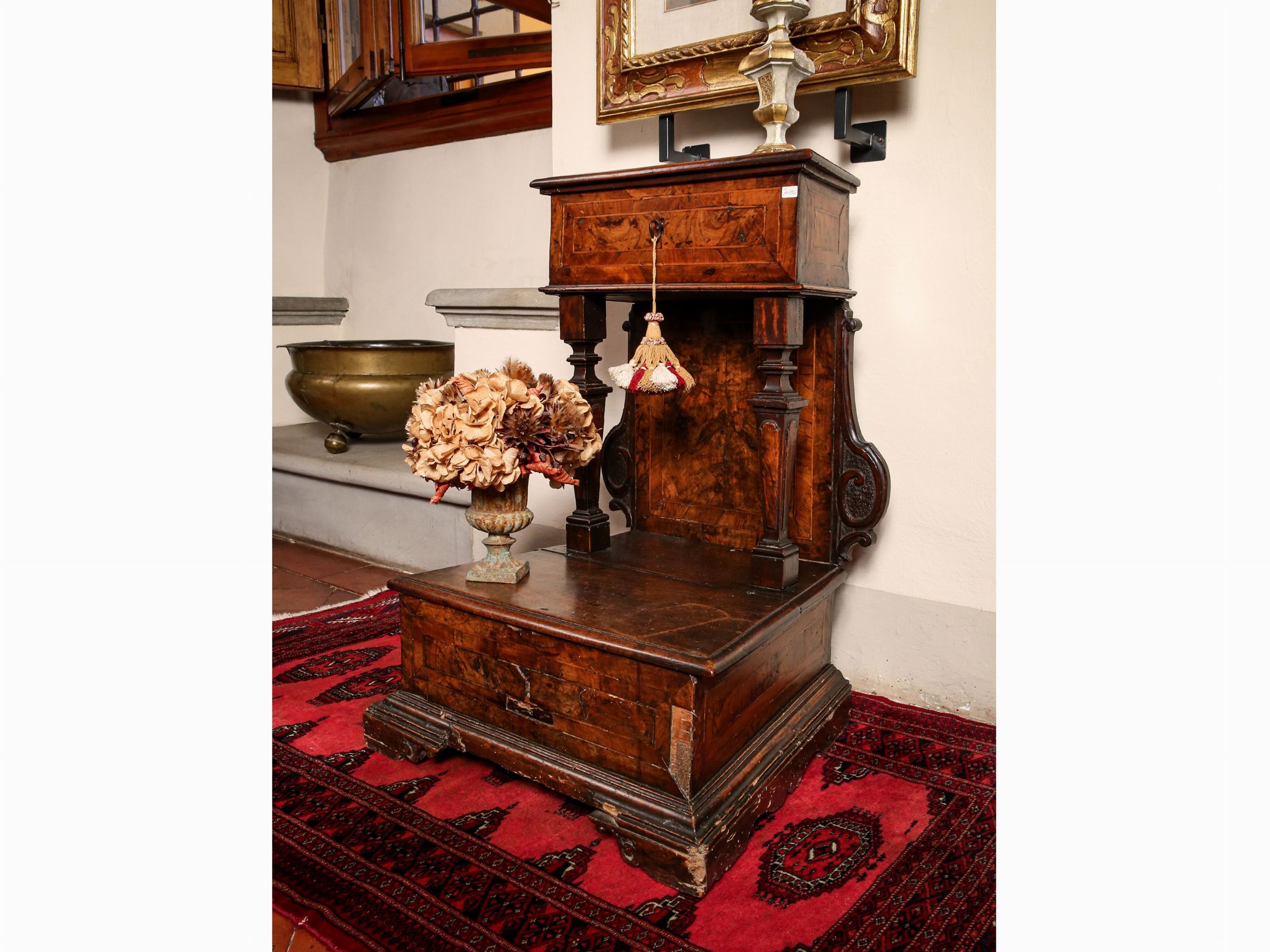 prima metà del XVIII secolo intarsiato con filettature in legni di frutto, un cassetto sorretto da due colonne a faretra, base da alzarsi, piedi a mensola, mancanze e difetti all'impiallacciatura