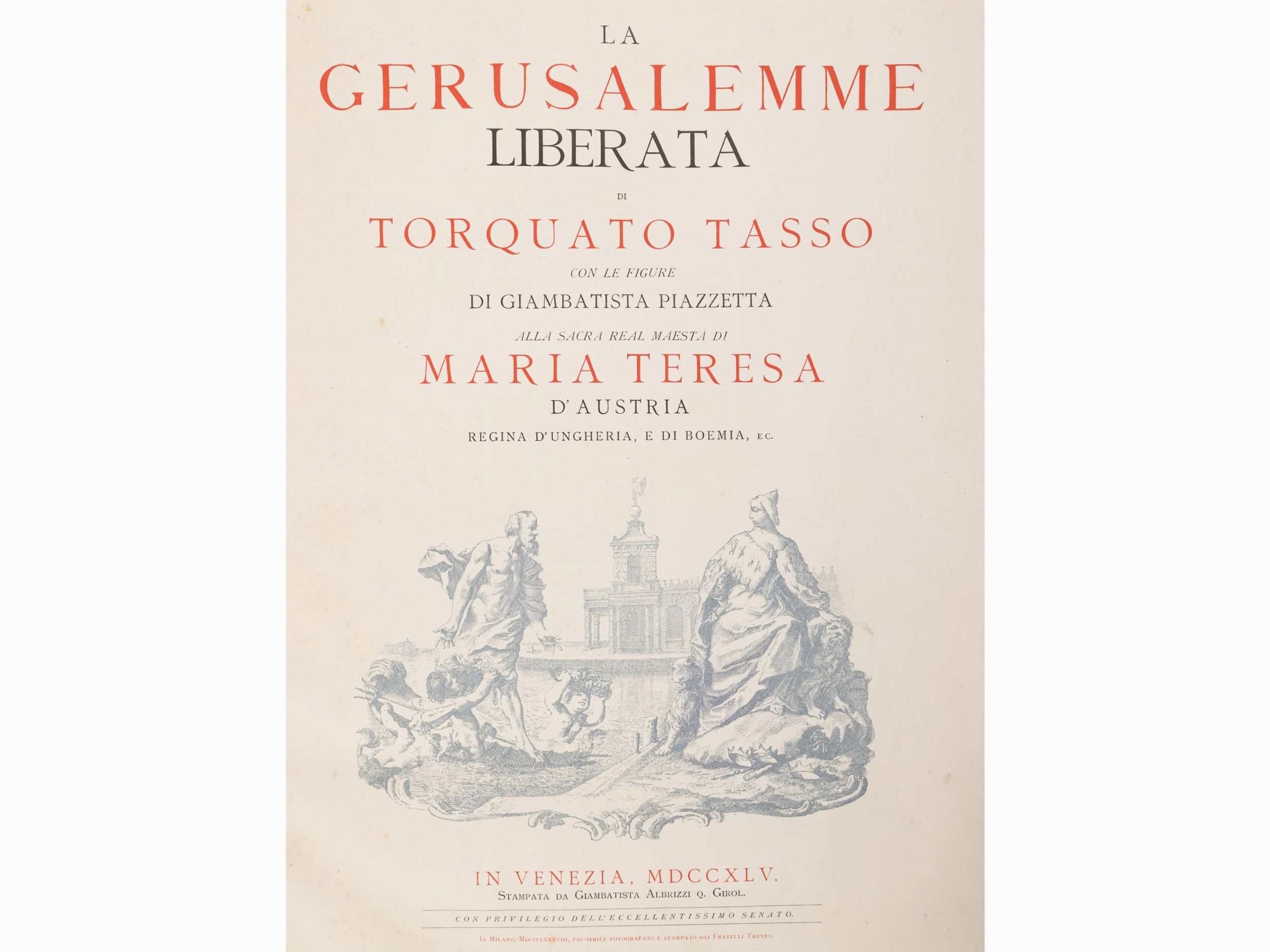- Milano: Treves, 1888. In folio (44x33 cm). Legatura in mz. pelle con evidenti difetti. Facsimile della celebre edizione stampata in Venezia, con le figure di Giambatista Piazzetta, da Giambatista Albrizzi nel 1745. Celebre riproduzione ottocentesca, del tutto fedele all'edizione originale, di uno dei più grandi capolavori figurati dell'editoria settecentesca italiana. Difetti