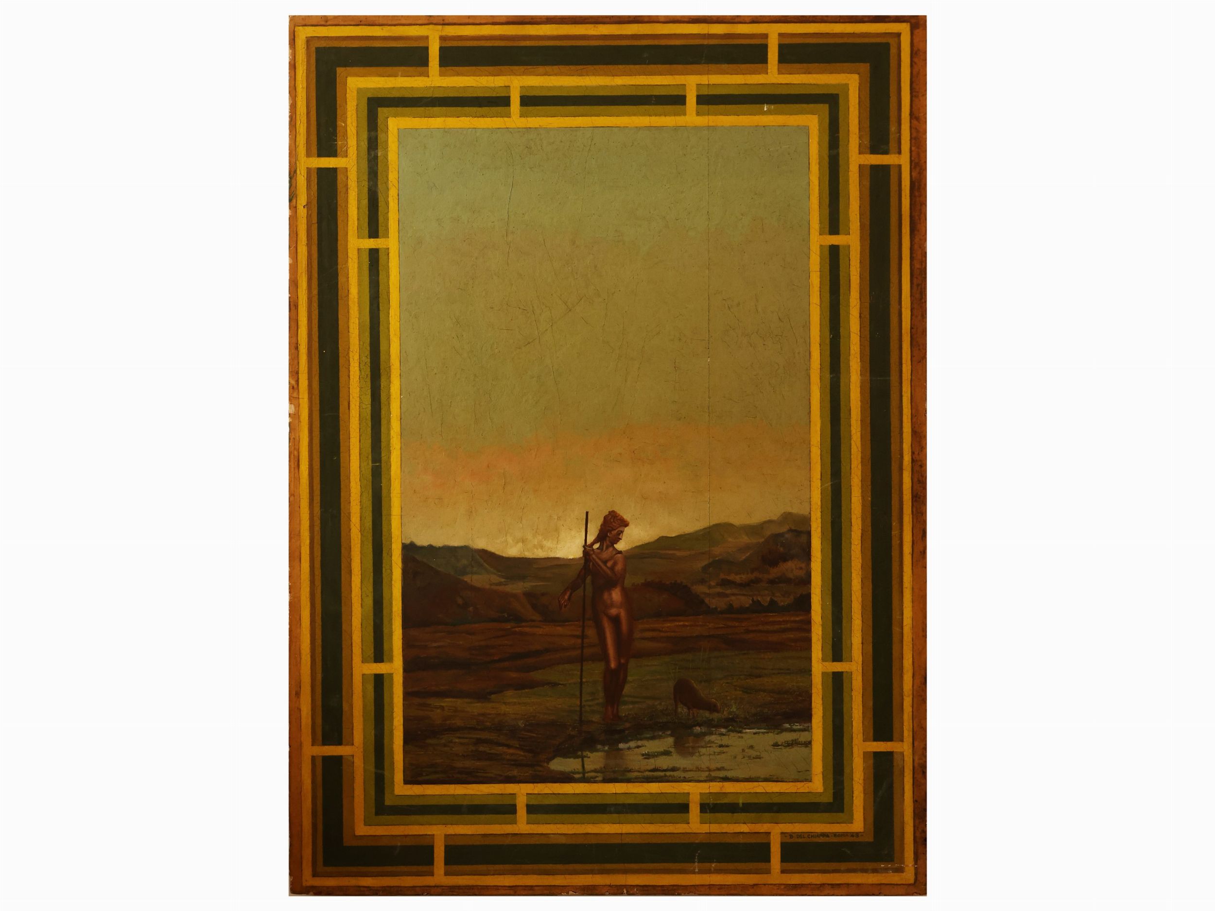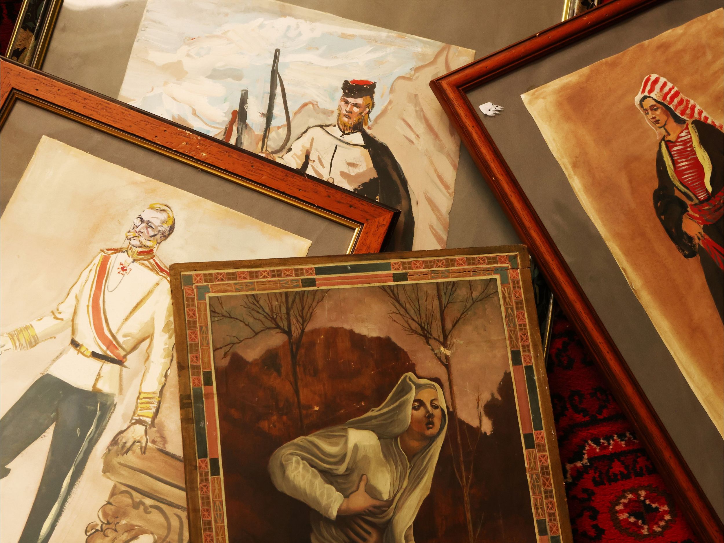 XX secolo raccolta di dipinti a tecnica mista su carta raffiguranti costumi teatrali e due dipinti con scene allegoriche, lievi difetti