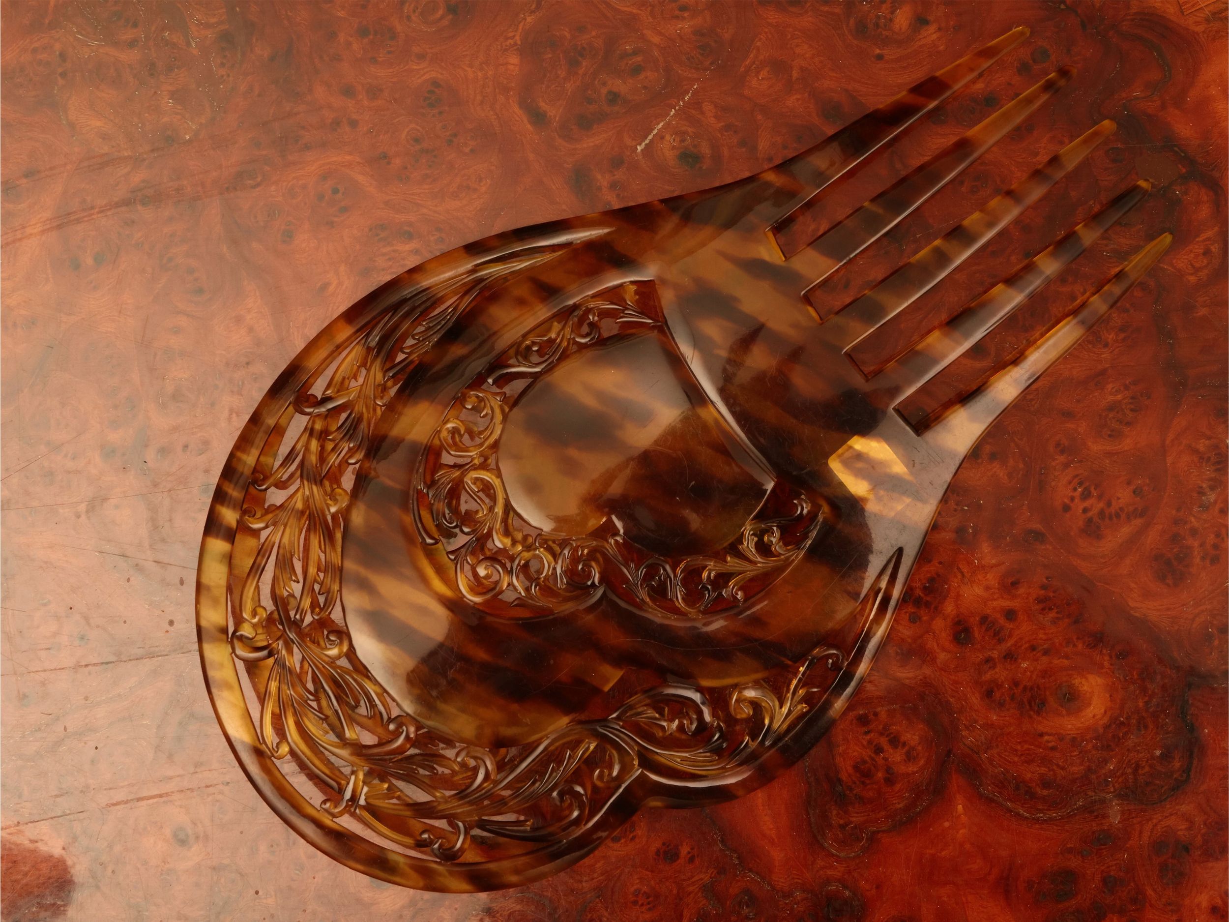 XIX/XX secolo composto da una grande pettinessa per acconciatura, una fibbia in metallo smaltato (lievi difetti), una penna ed un indicatore
