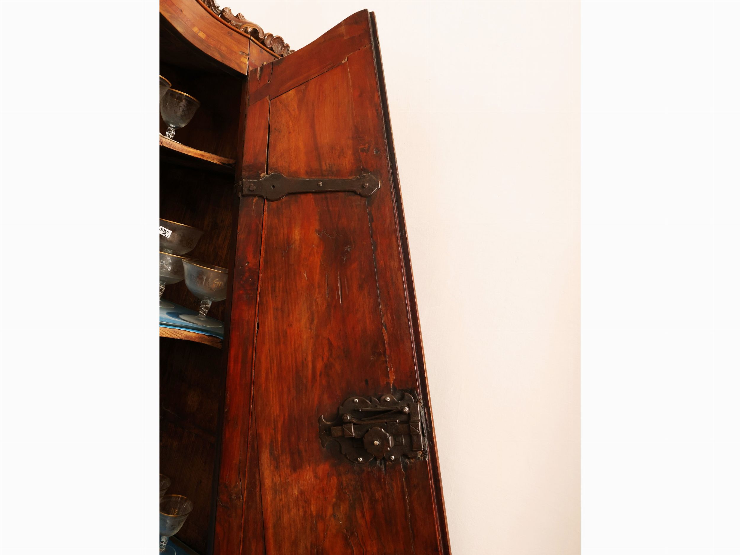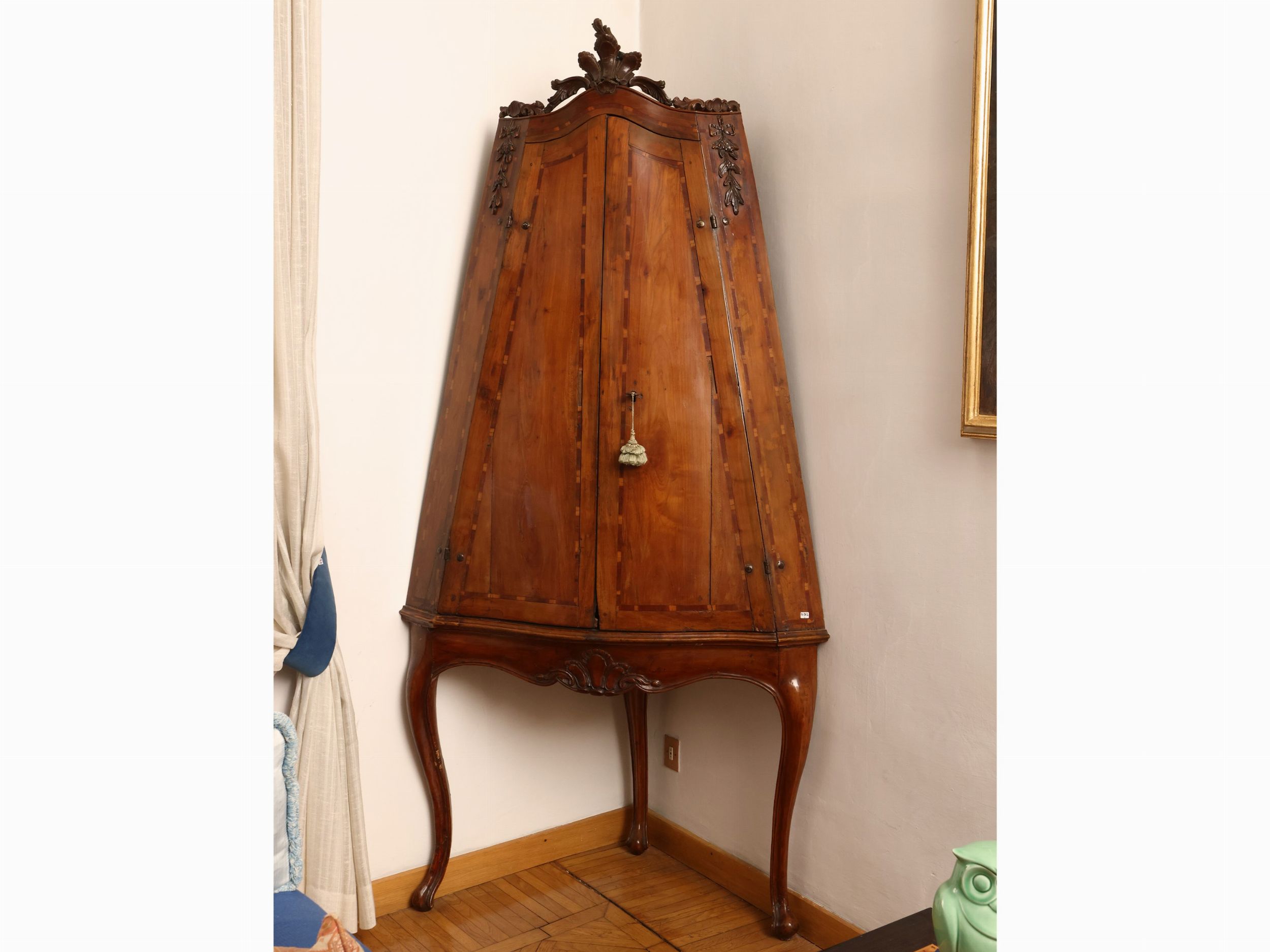 h cm 220x116x82 circa Veneto, seconda metà del XVIII secolo di forma piramidale, intarsiato con filettature a nastro in legni di frutto, cimasa sormontata da cresta vegetale con racemi ricadenti ai lati come ghirlande, due sportelli sul fronte con lieve mossa, pendaglina intagliata con lo stesso motivo della cimasa, tre alte gambe mosse con piedini a ricciolo