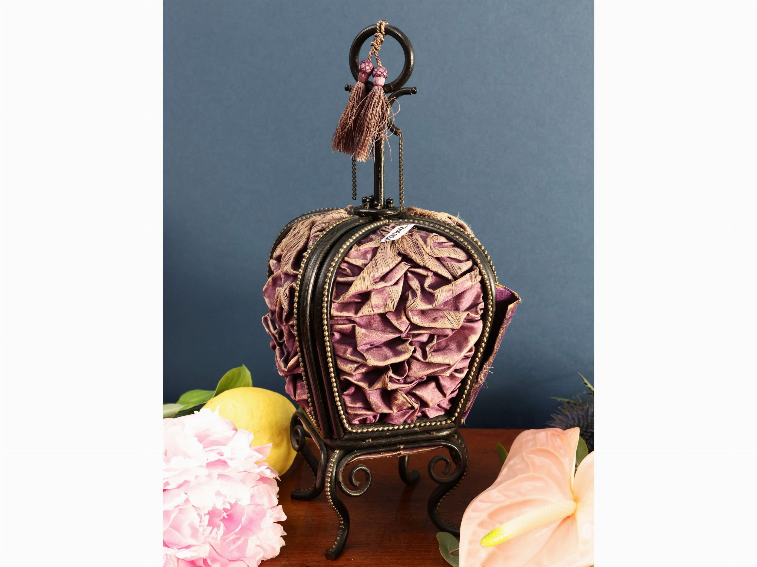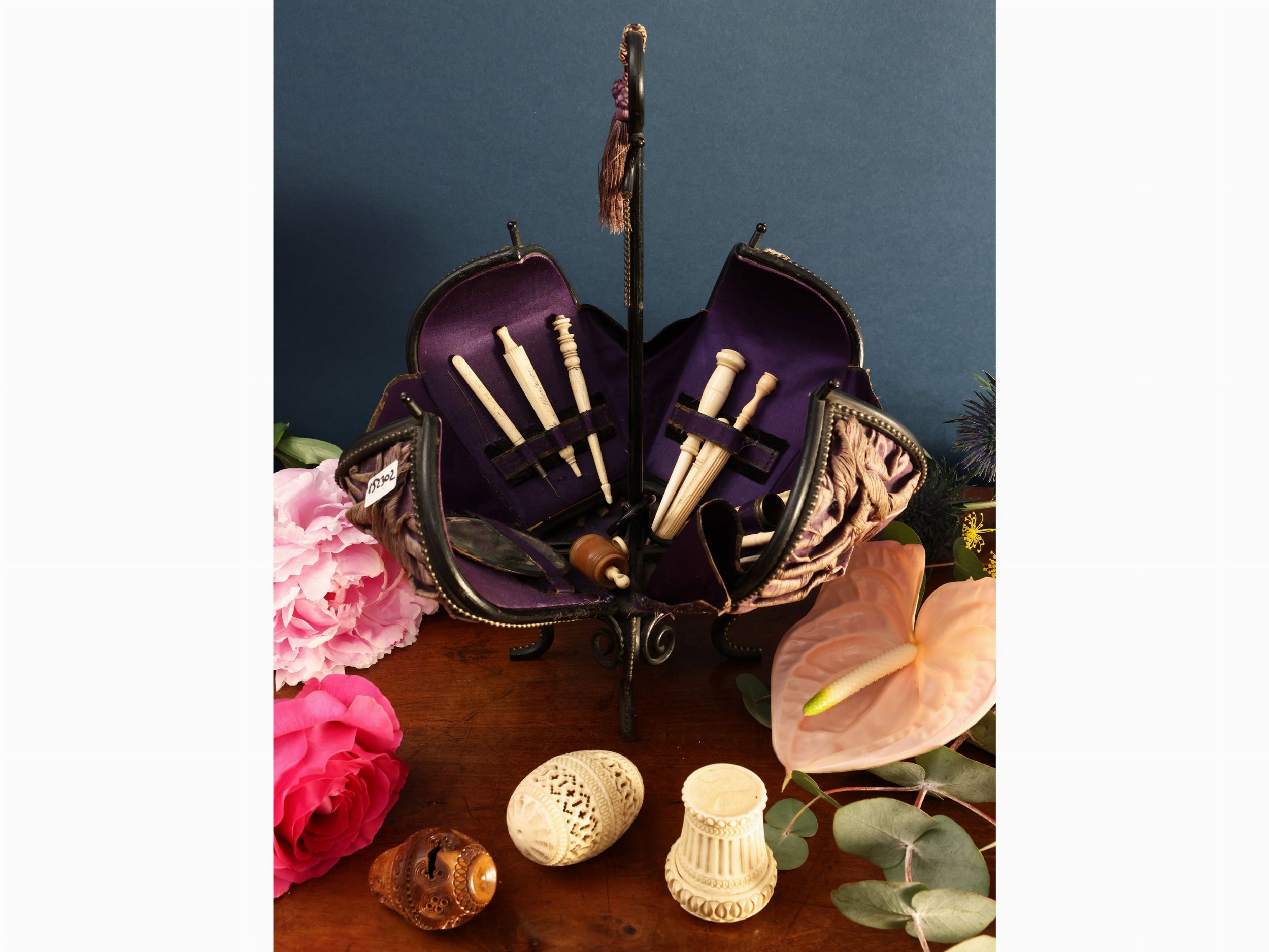 h cm 34 Inghilterra, seconda metà del XIX secolo realizzato come una corona rivestita in seta goffrata viola che si apre a corolla di quattro petali contenenti set da cucito in avorio finemente inciso e traforato con motivi di gusto esotico, composto da due piccole scatole portaaghi, una a foggia di cestino e l'altra di uovo ed altri dodici piccoli accessori tra cui due portaaghi a foggia di ombrellini ed uno in legno di bosso, alcuni difetti