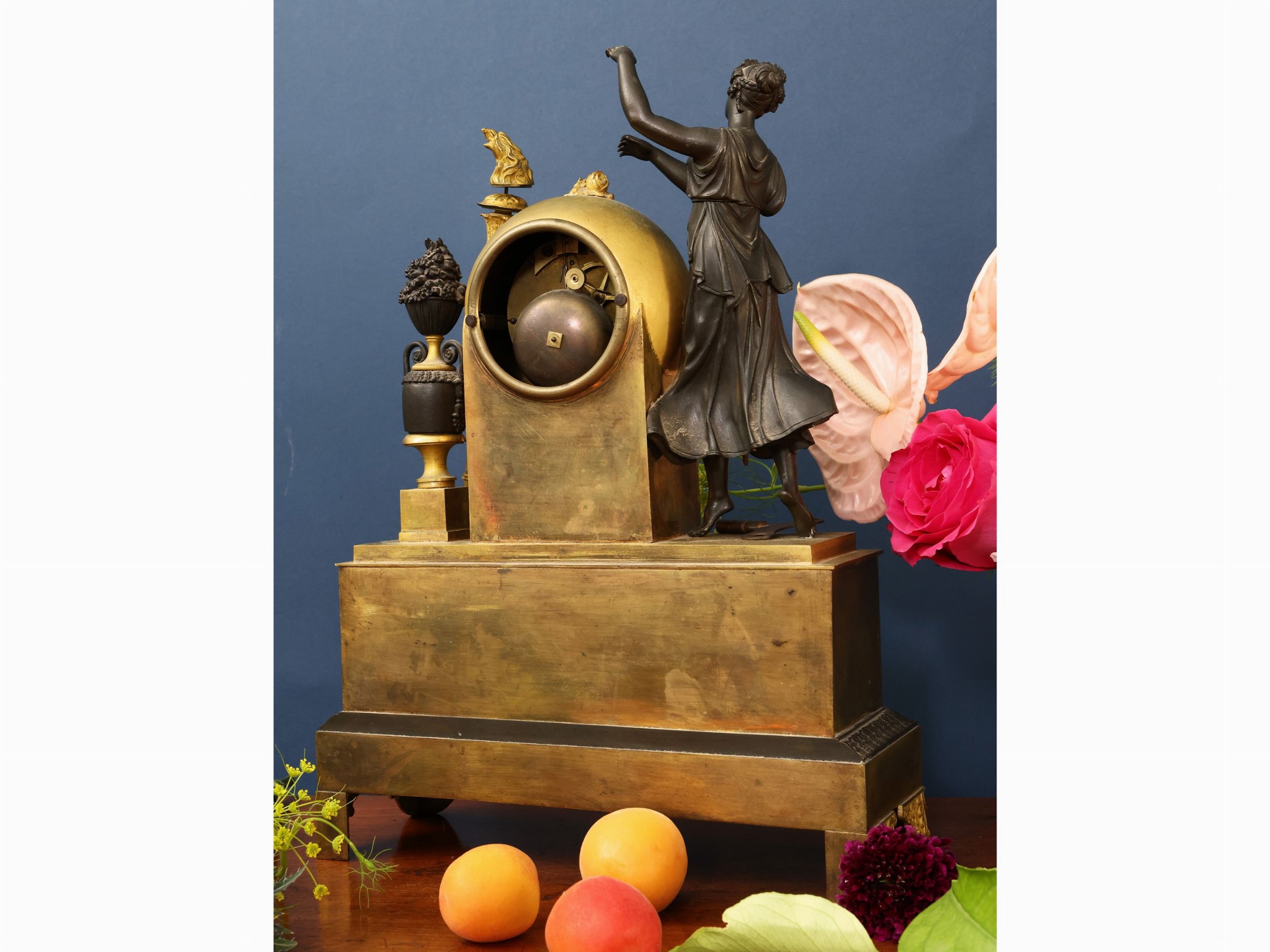 prima metà del XIX secolo sormontato da figura femminile allegorica, decorato con motivo a vaso, festoni e cherubini a bassorilievo, quadrante con numeri romani su base a plinto, corredato di chiave di carica, alcuni difetti