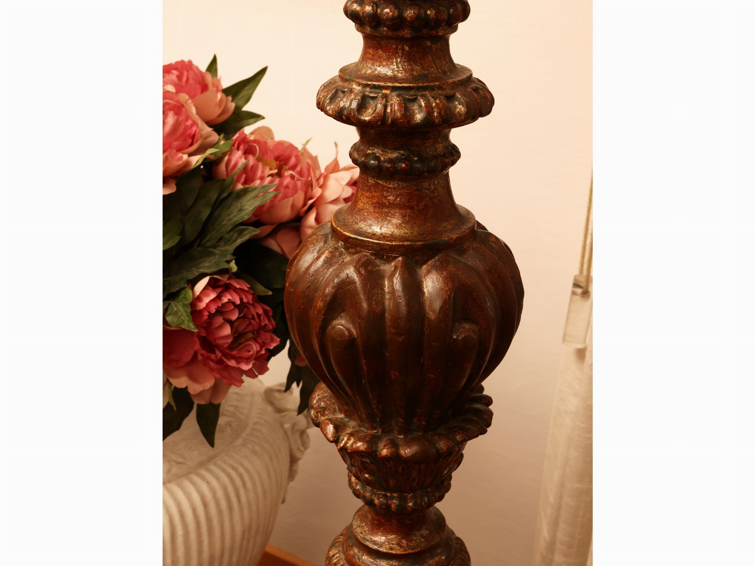 intagliata con motivi di foglie d'acanto e ghirlande, corredata di paralume, alcuni difetti