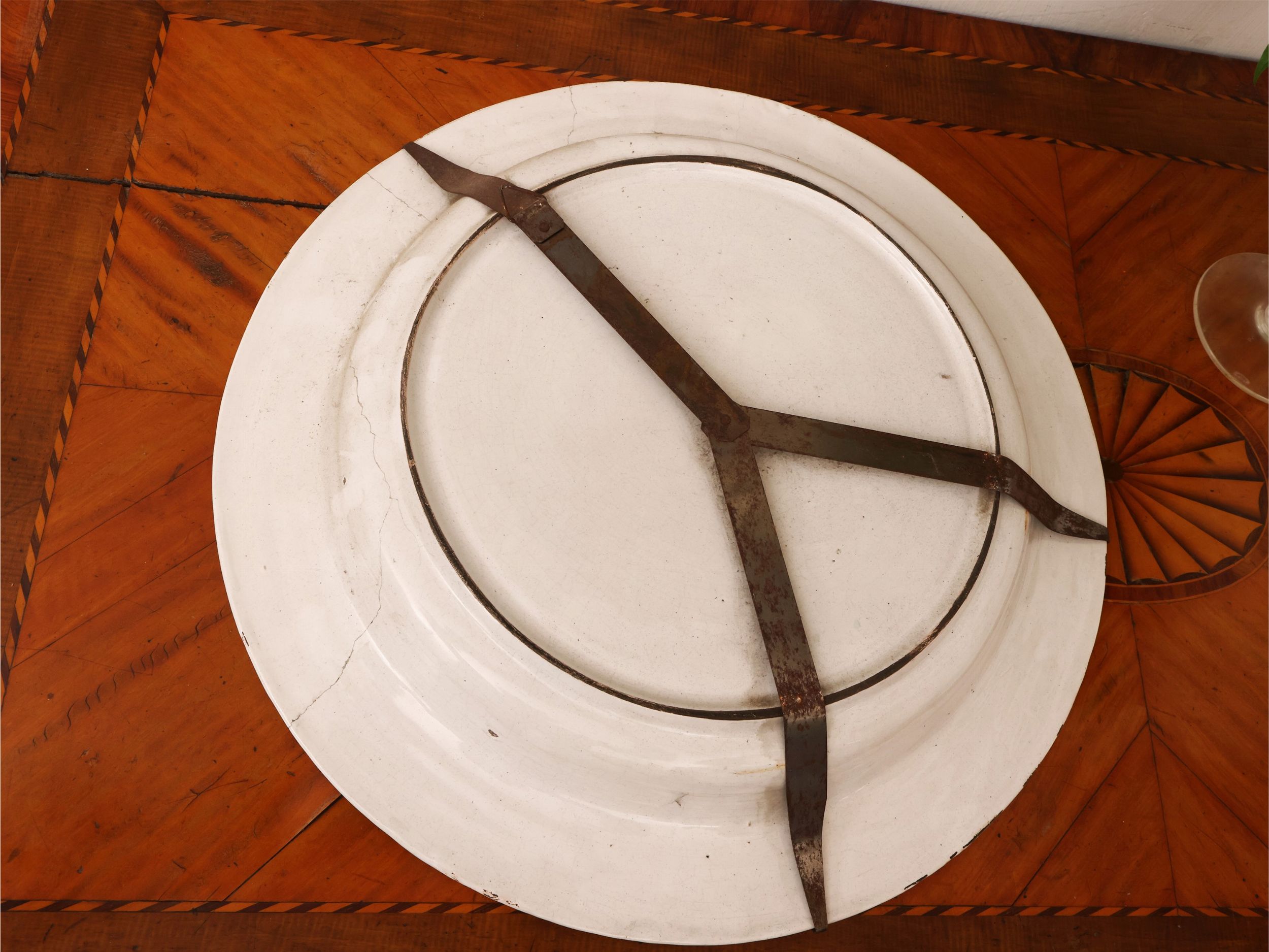 XVIII secolo dipinto al centro con cacciatore con falcone, tesa con festone di motivi vegetali, alcuni difetti