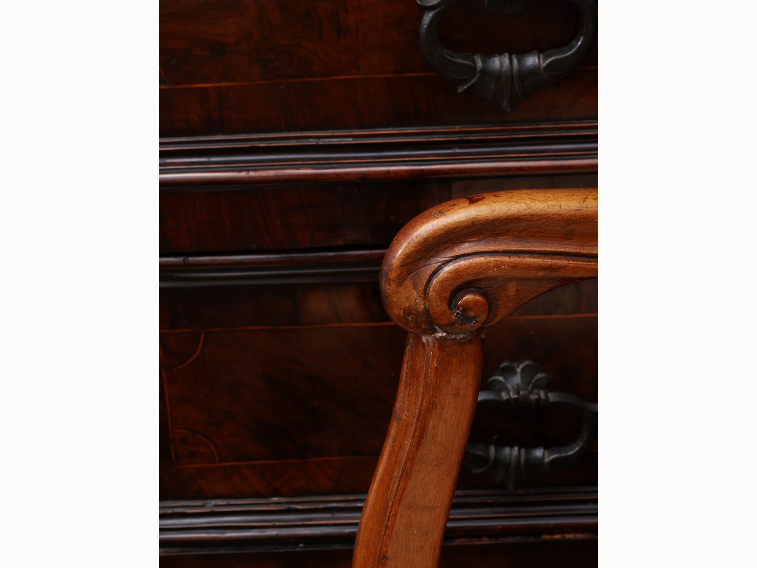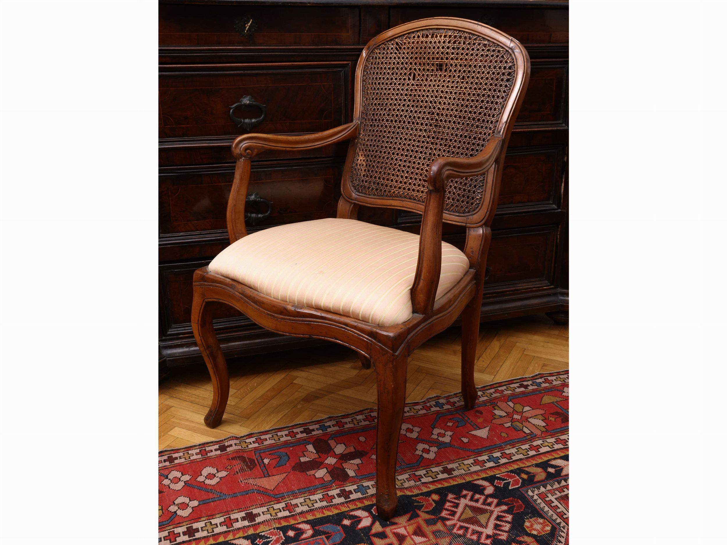 seconda metà del XVIII secolo schienale centinato in paglia di Vienna, braccioli a giorno, gambe mosse, sedile rivestito in raso color giallo oro, corredata di piccolo cuscino, alcuni difetti