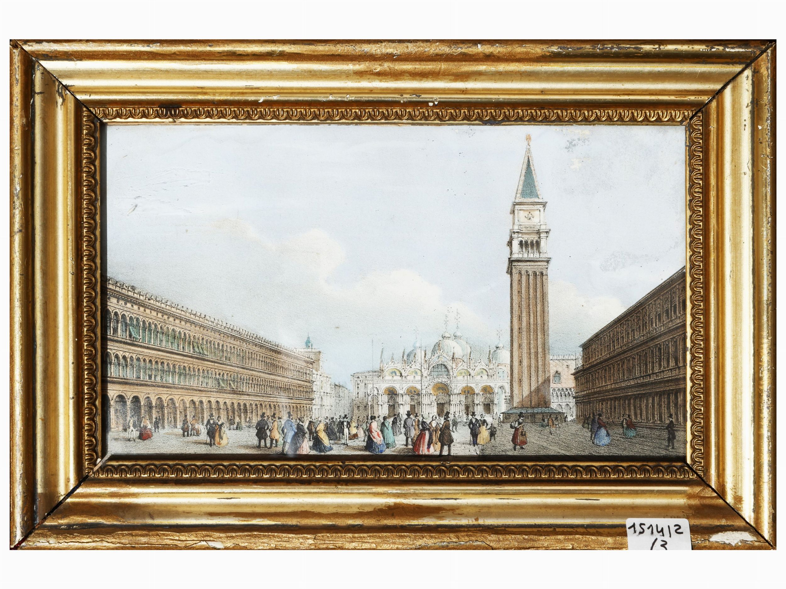 fine del XIX secolo tre litografie con acquerellatura, in cornice, alcuni difetti